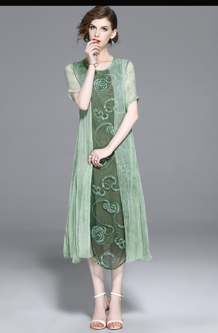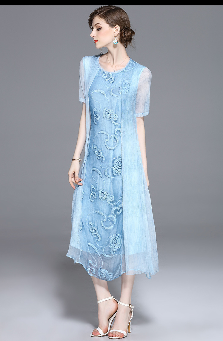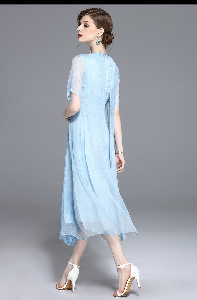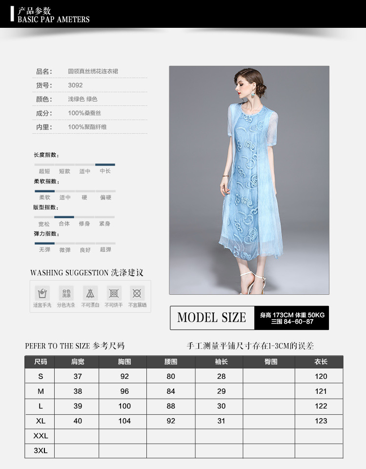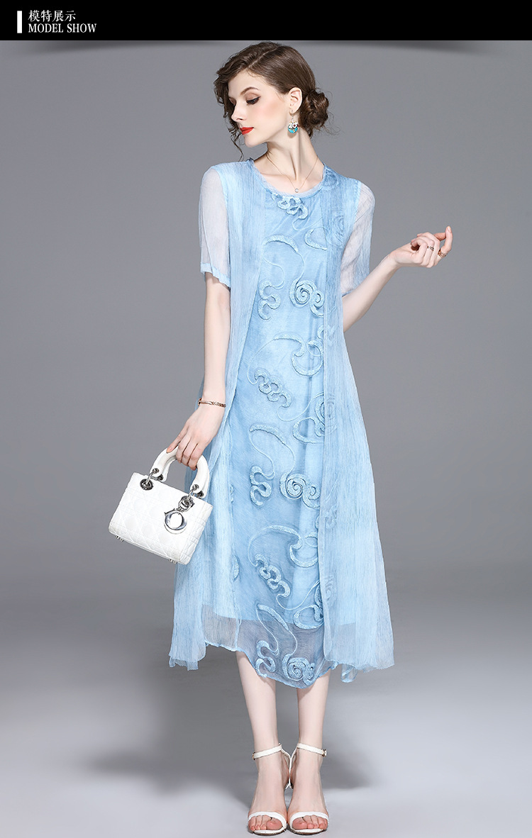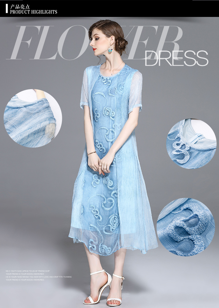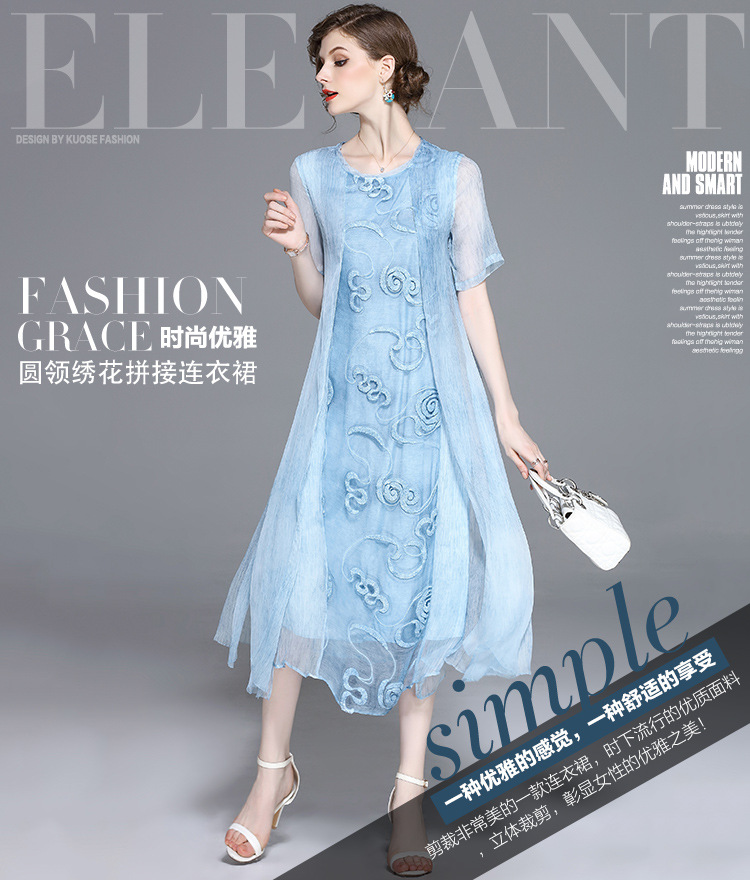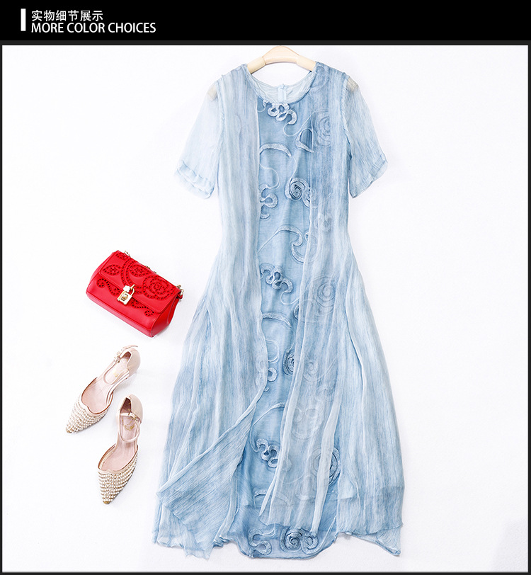 美汇特供:2017夏季新款欧美女装真丝拼接刺绣绣花修腰连衣裙