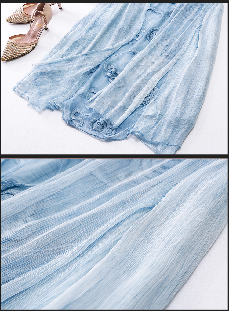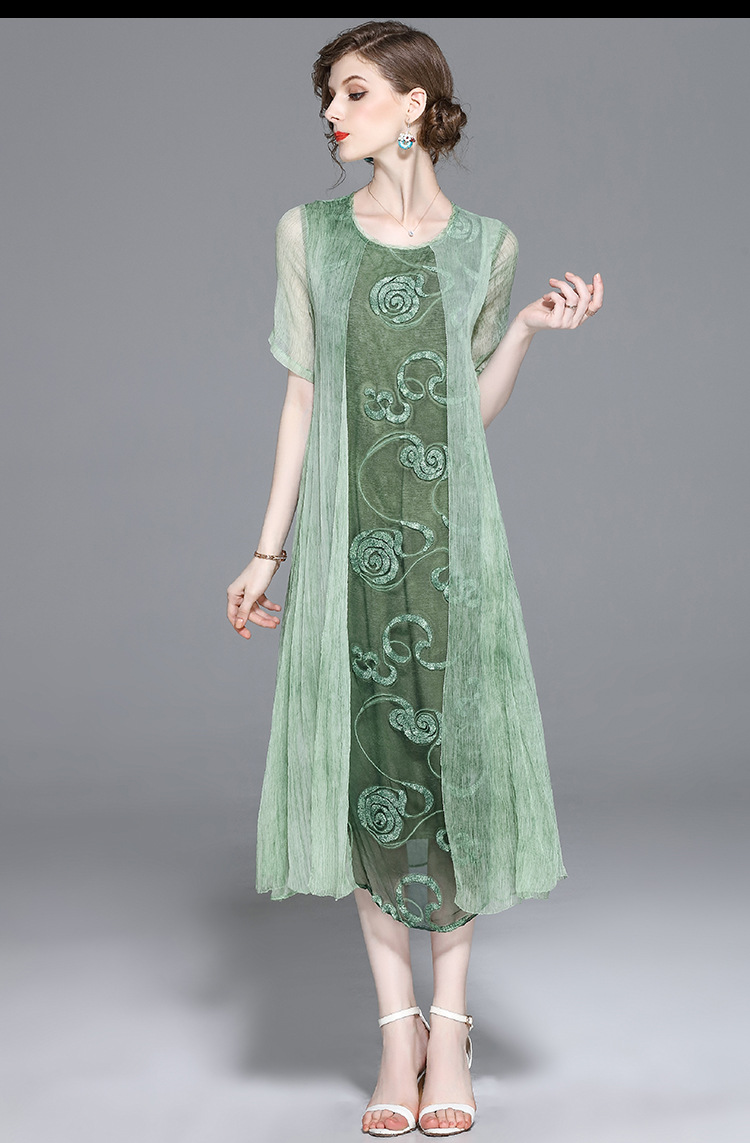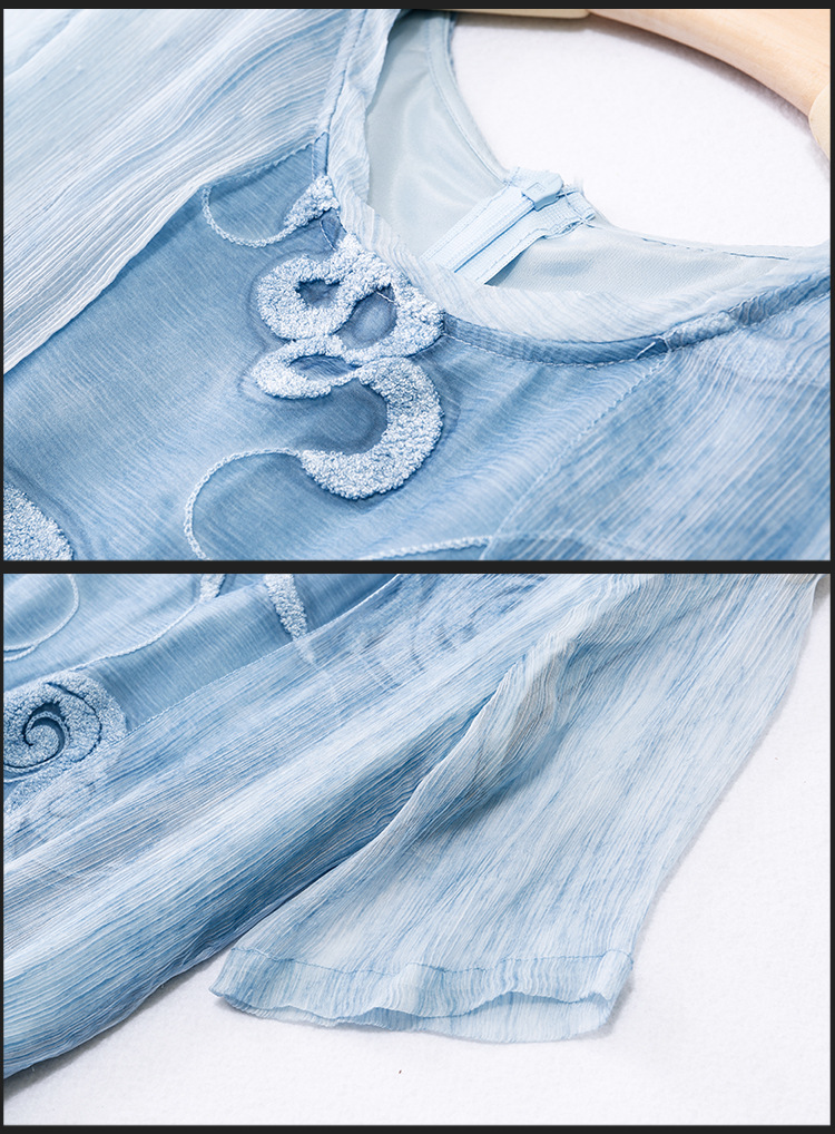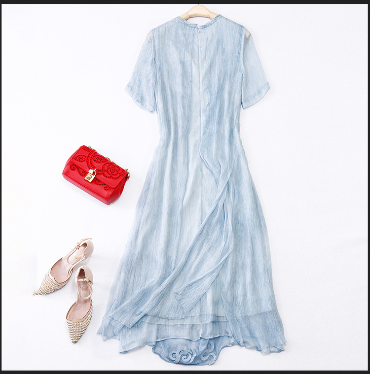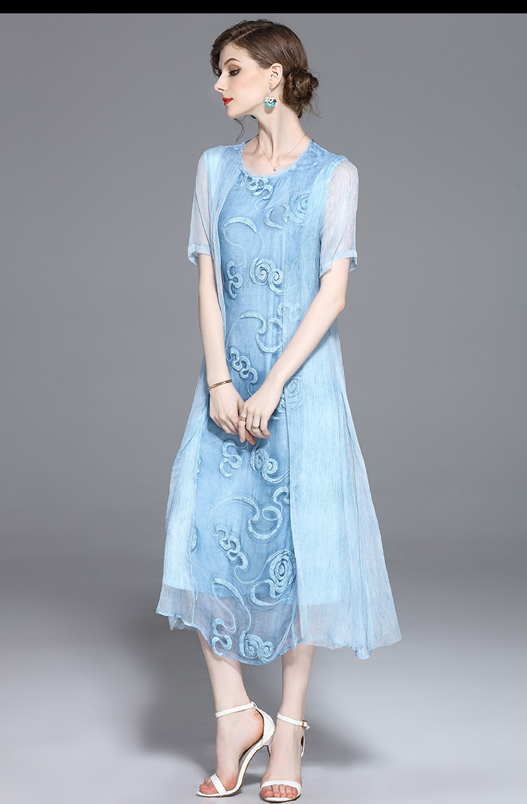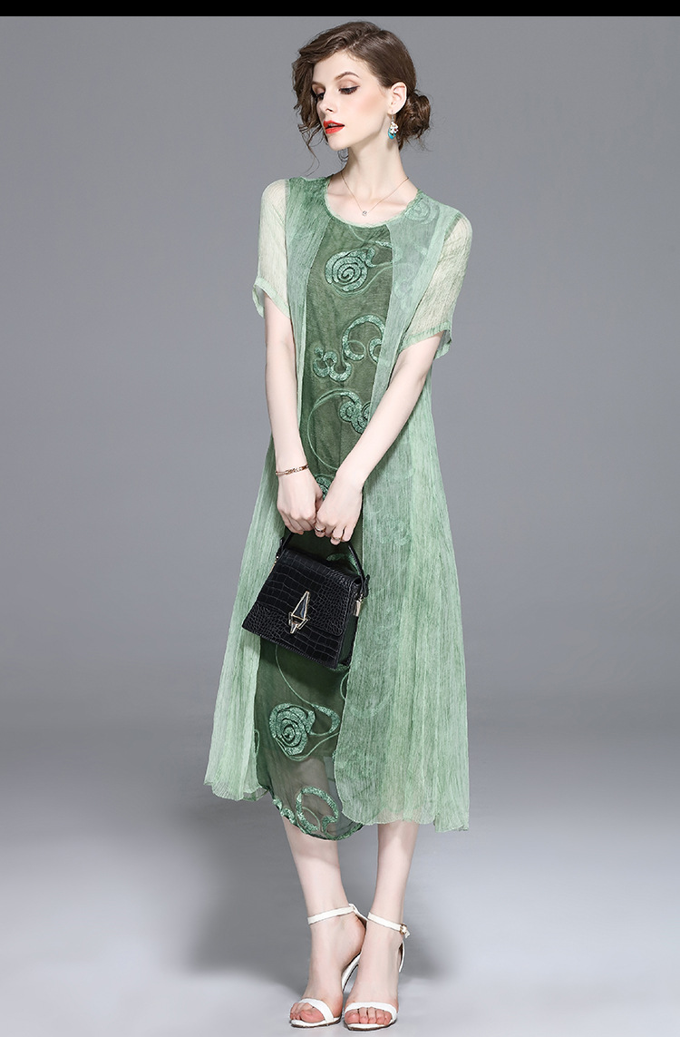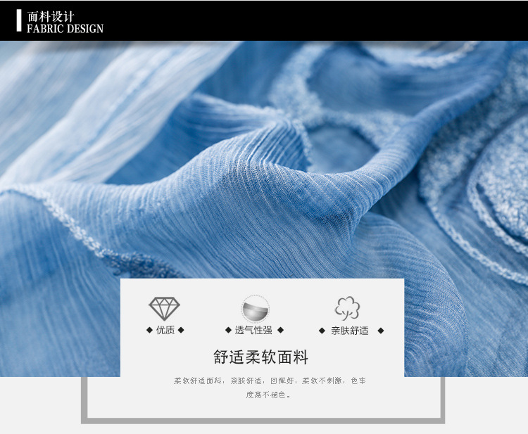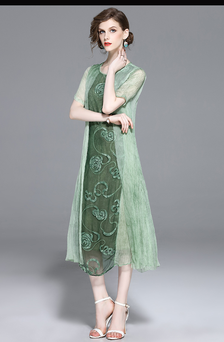 美汇特供:2017夏季新款欧美女装真丝拼接刺绣绣花修腰连衣裙