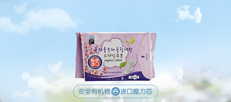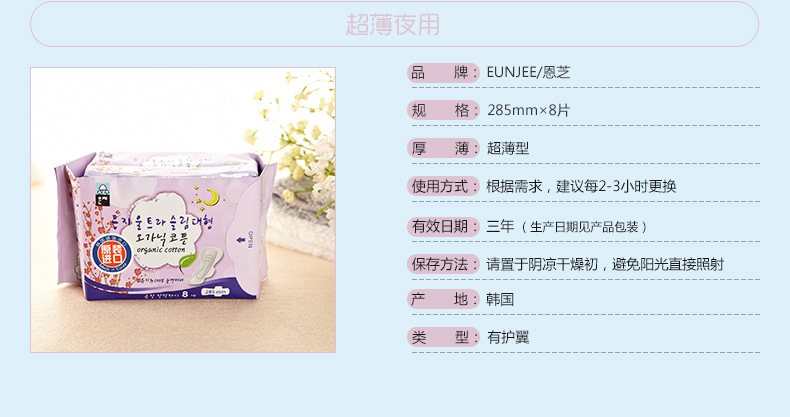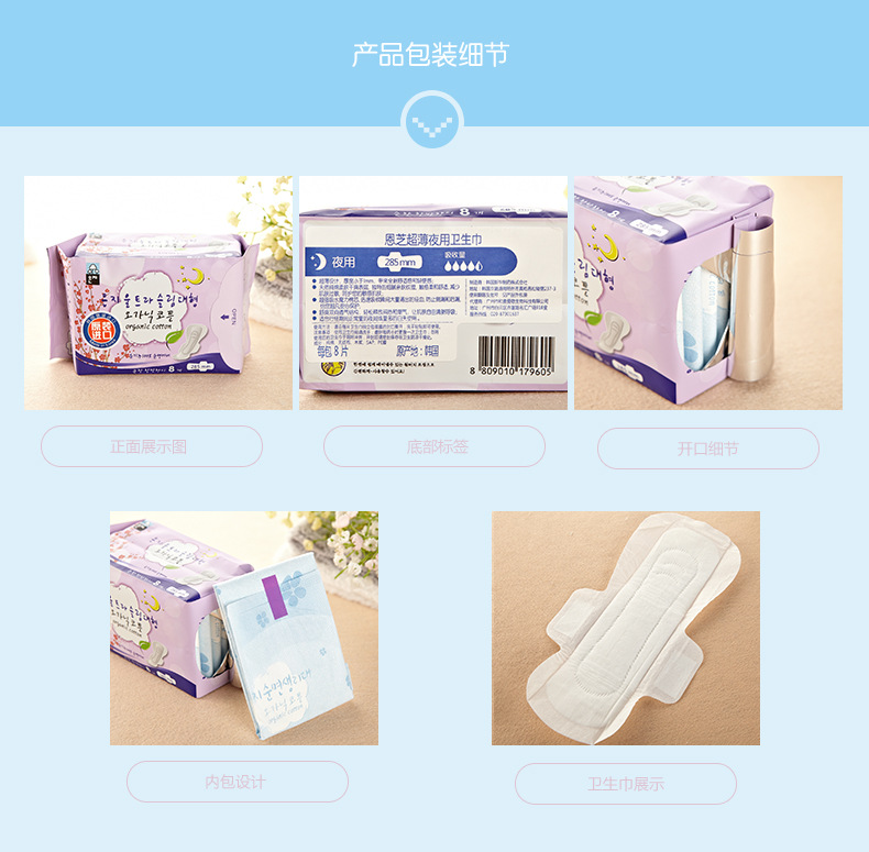 美汇特供:恩芝韩国进口超薄夜用卫生巾纯棉柔亲肤285mm/8片装*2包