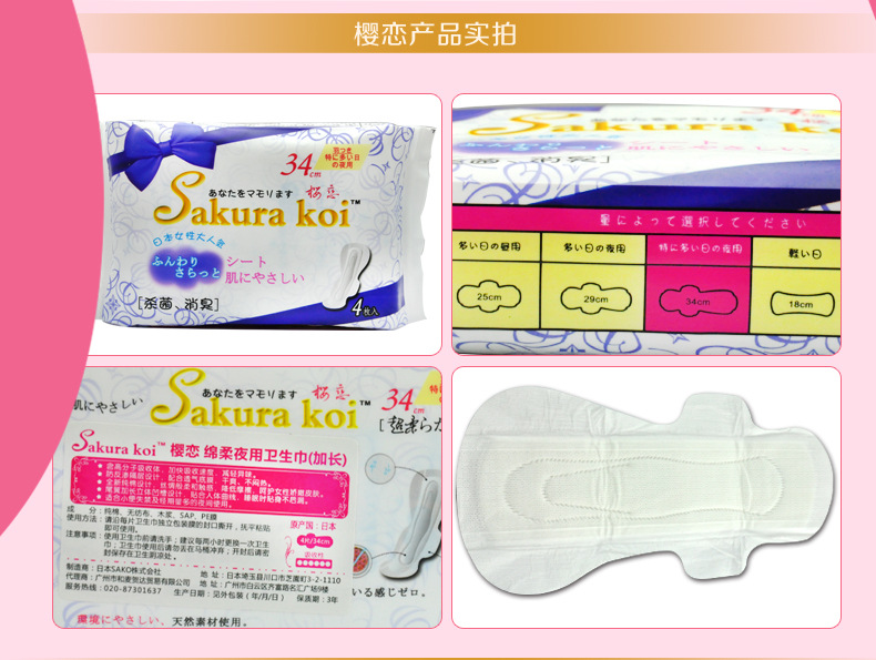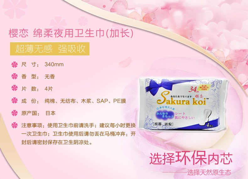 美汇特供:樱恋日本原装进口卫生巾 纯棉柔夜用加长型34cm/4片装*2包