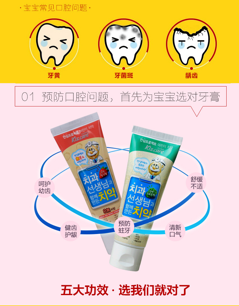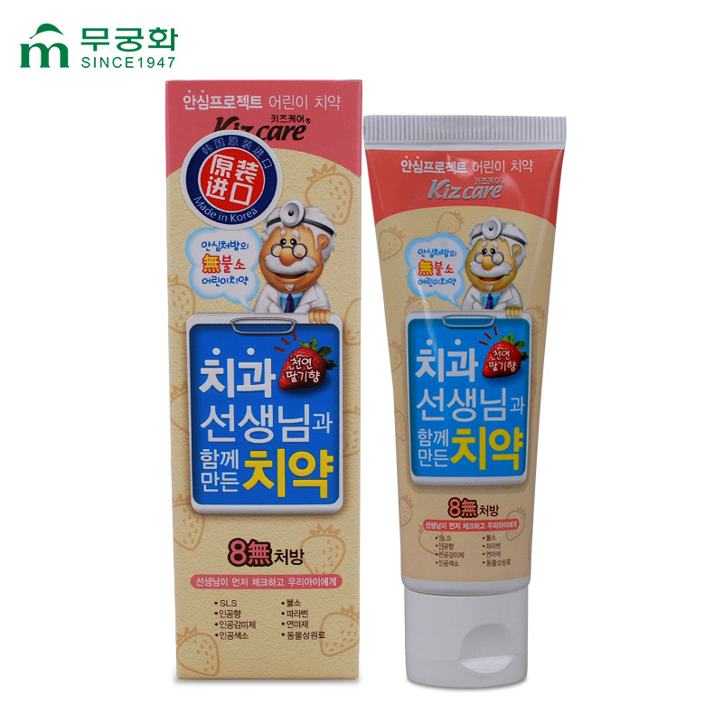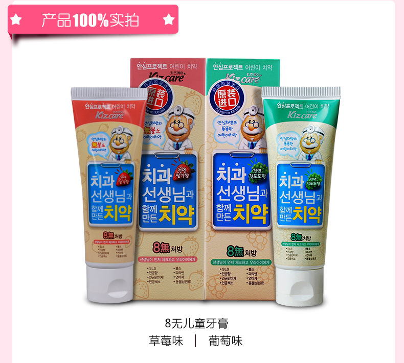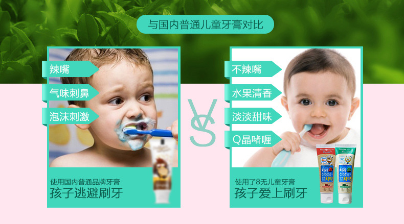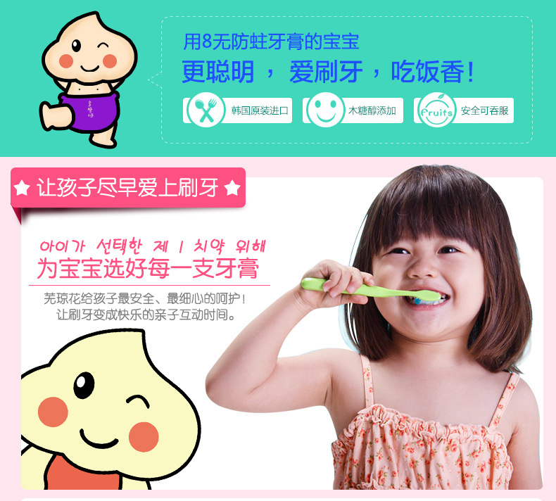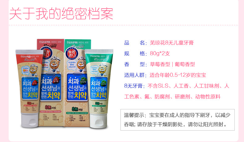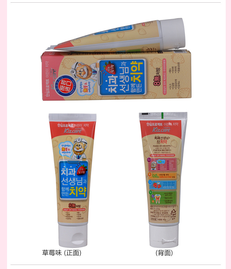 美汇特供:芜琼花韩国进口牙膏 无氟防蛀牙口腔护理8无儿童牙膏80g草莓味