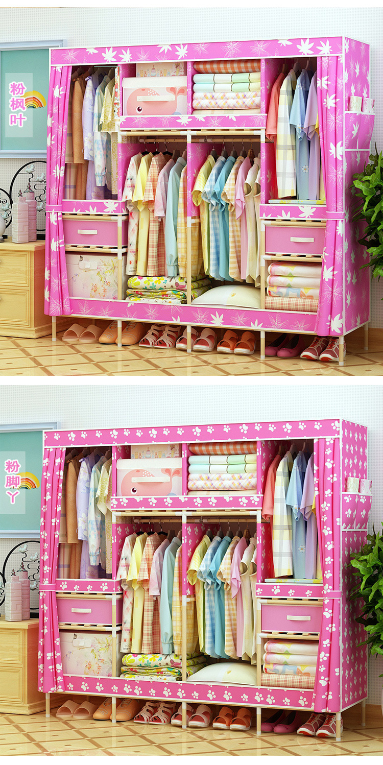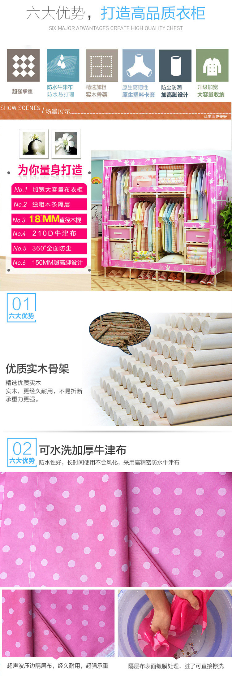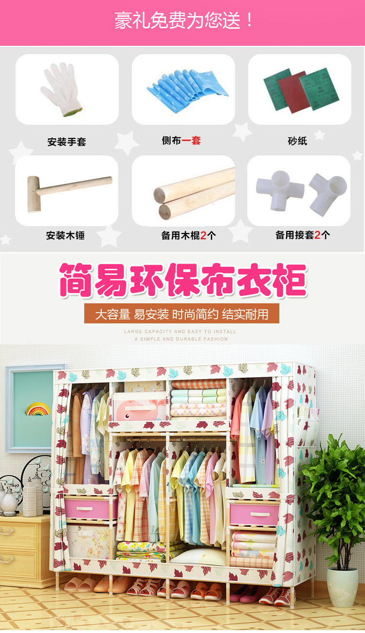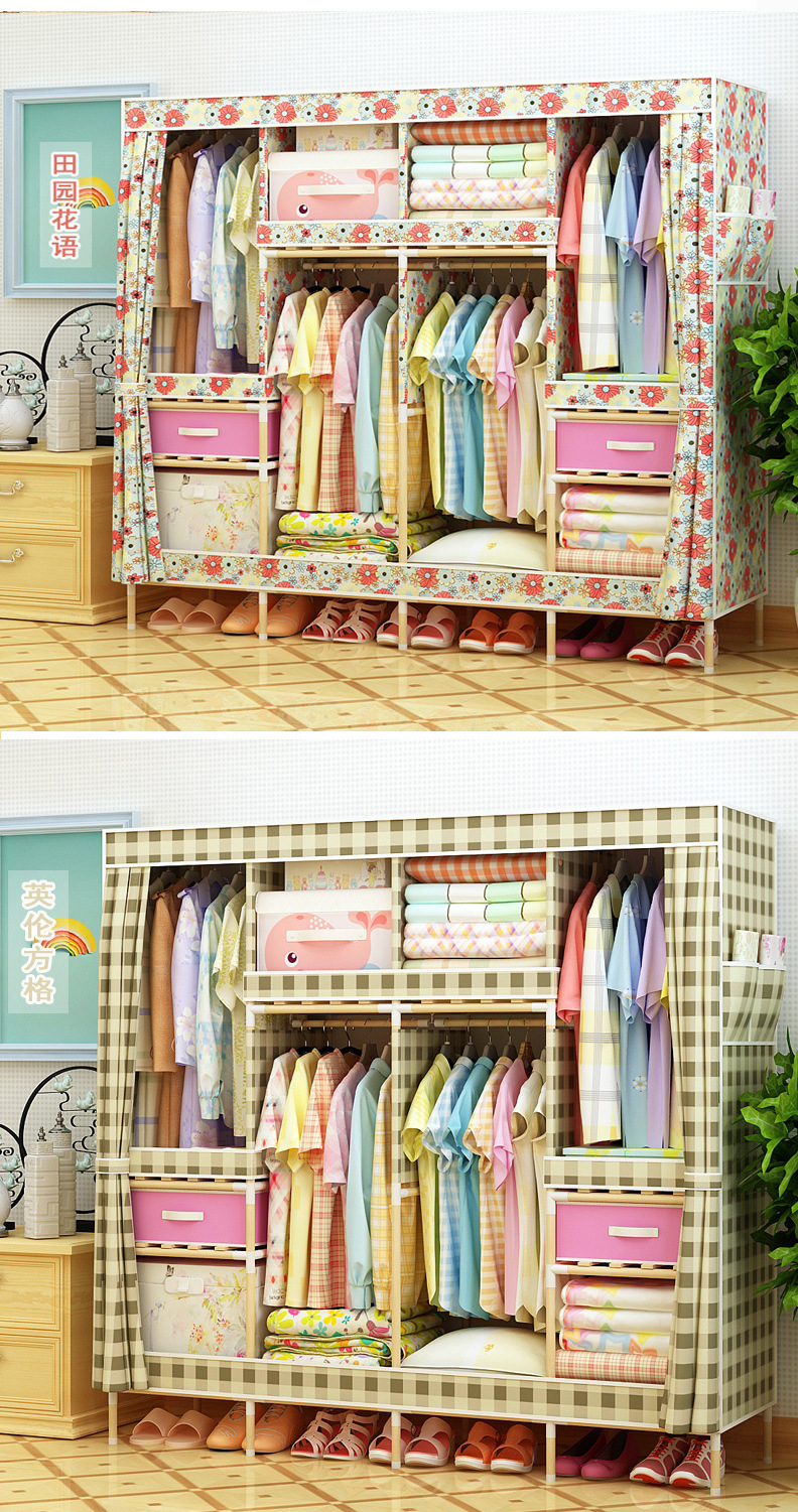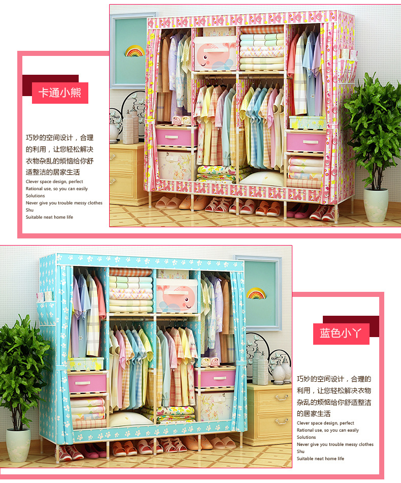 美汇特供:2017新款实木非钢管牛津布衣柜组装加固双人儿童衣橱送两抽屉简易衣柜布艺