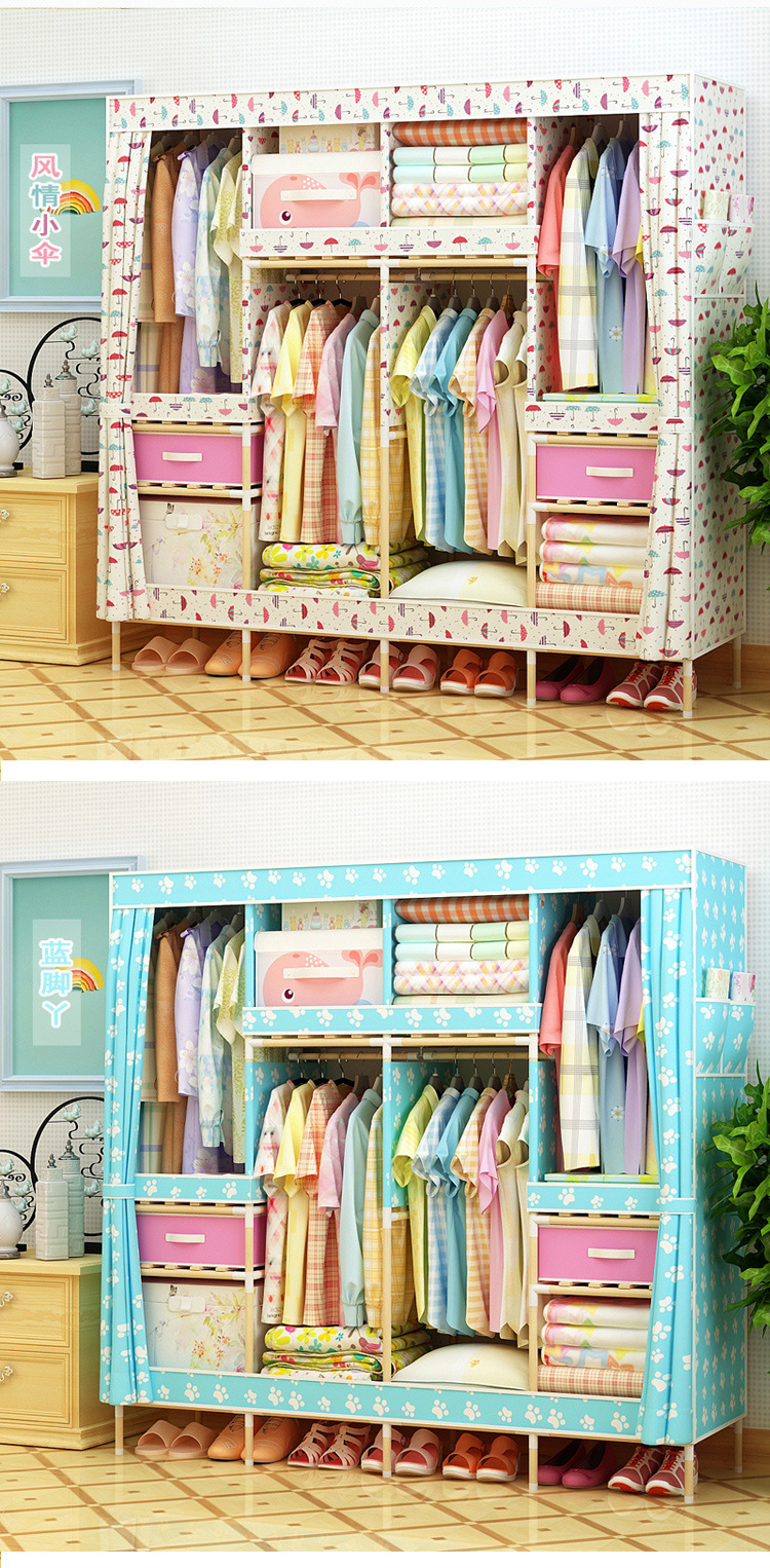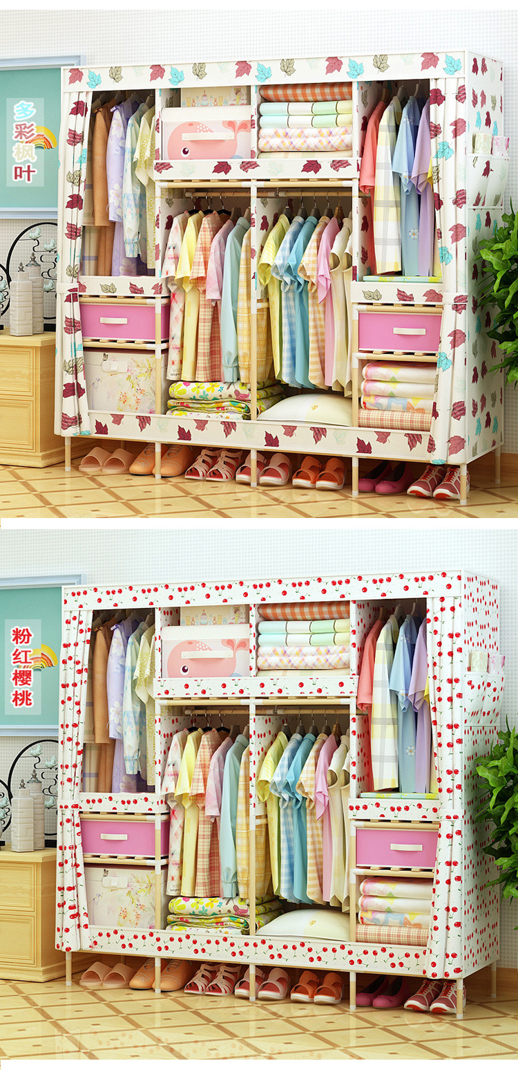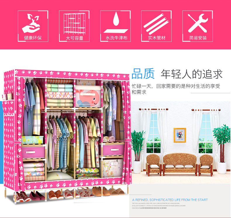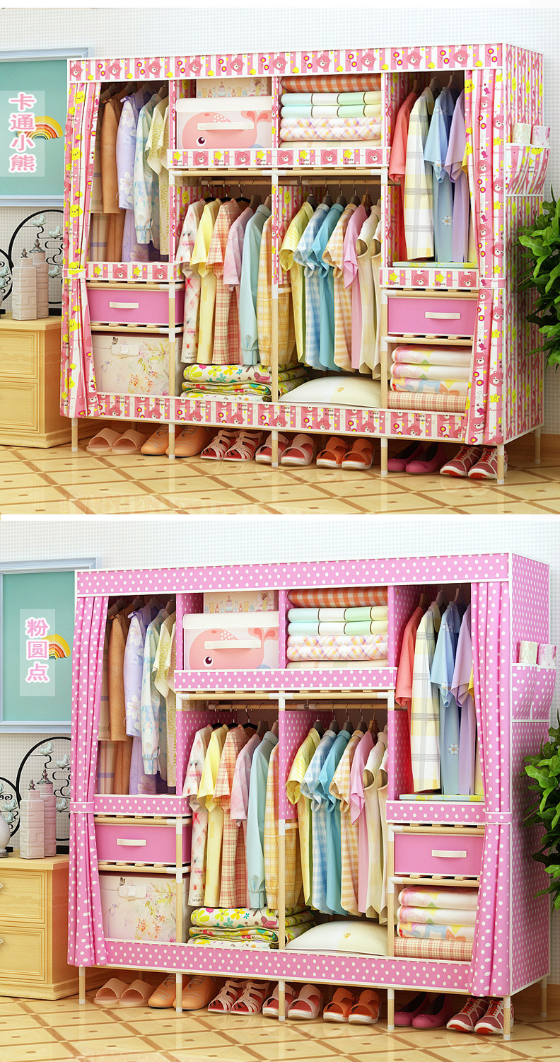 美汇特供:2017新款实木非钢管牛津布衣柜组装加固双人儿童衣橱送两抽屉简易衣柜布艺