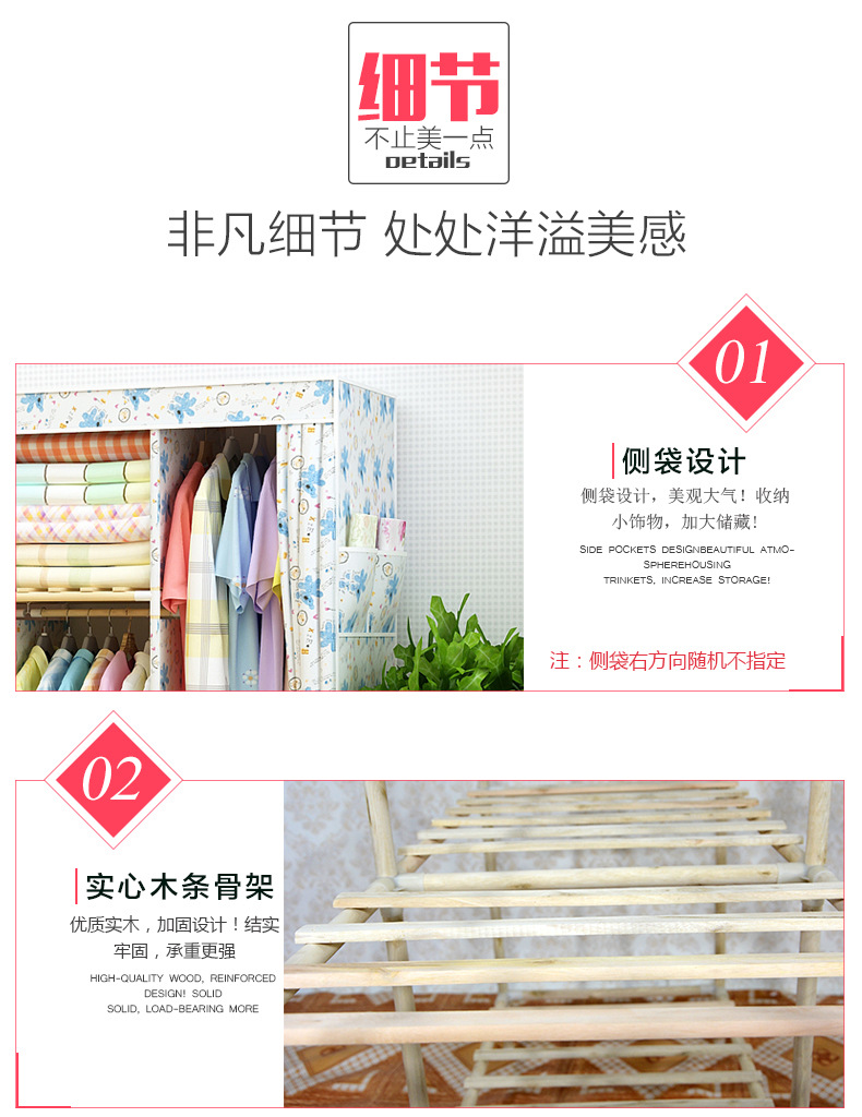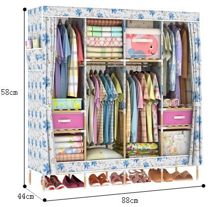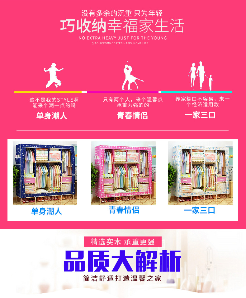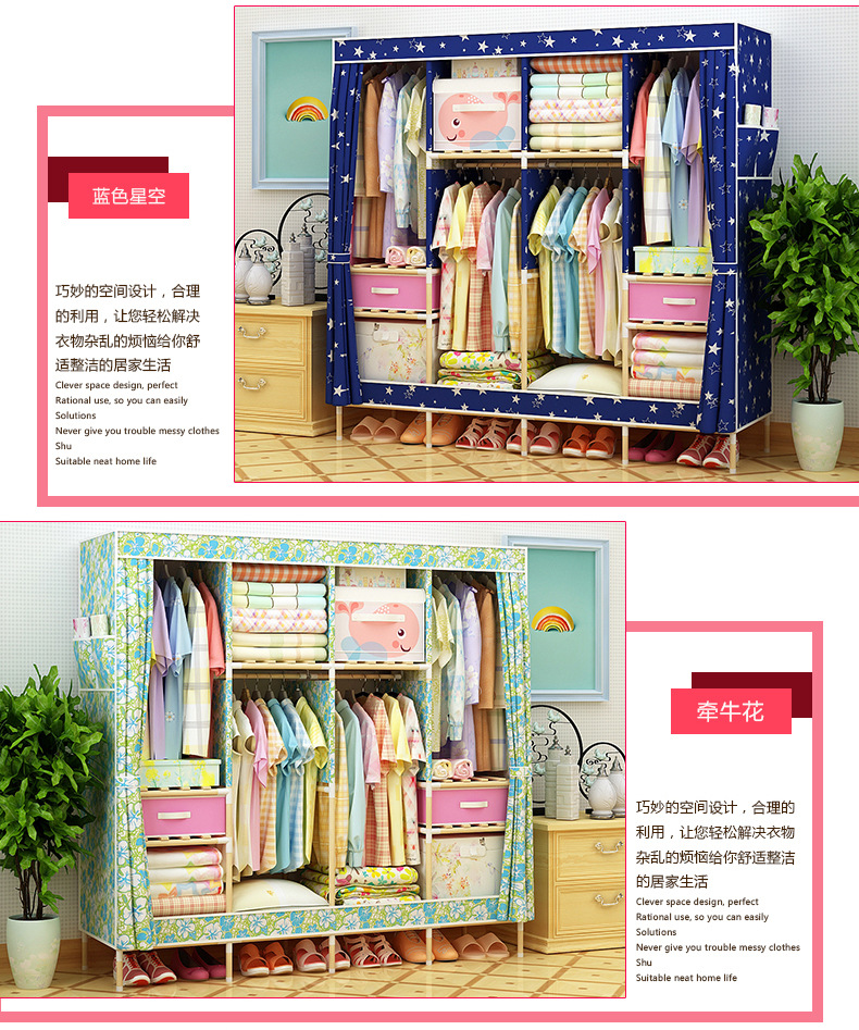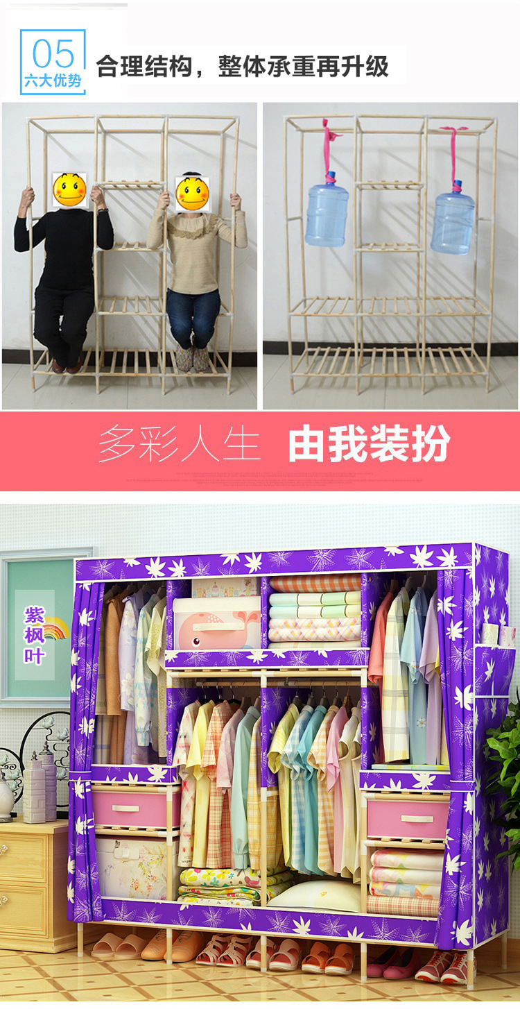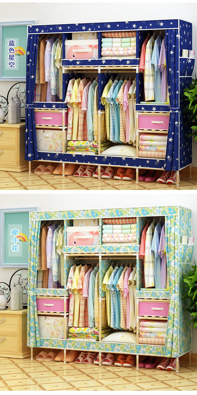 美汇特供:2017新款实木非钢管牛津布衣柜组装加固双人儿童衣橱送两抽屉简易衣柜布艺
