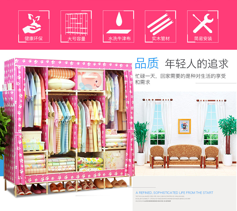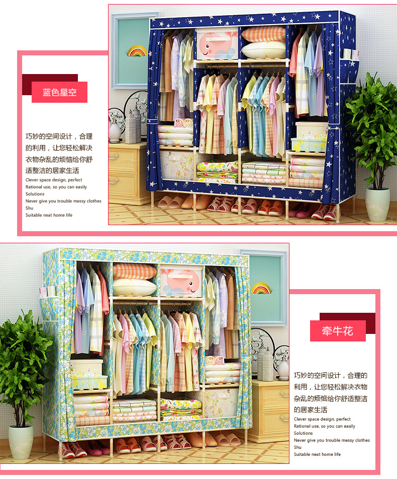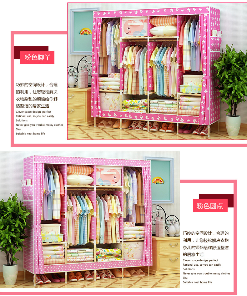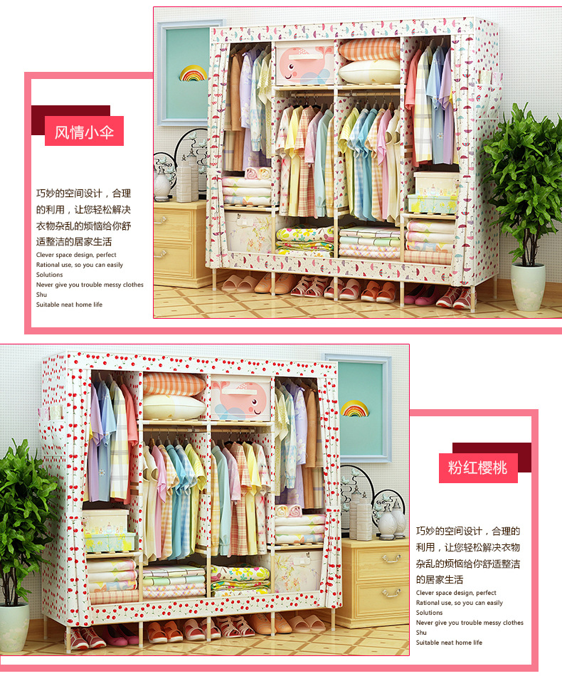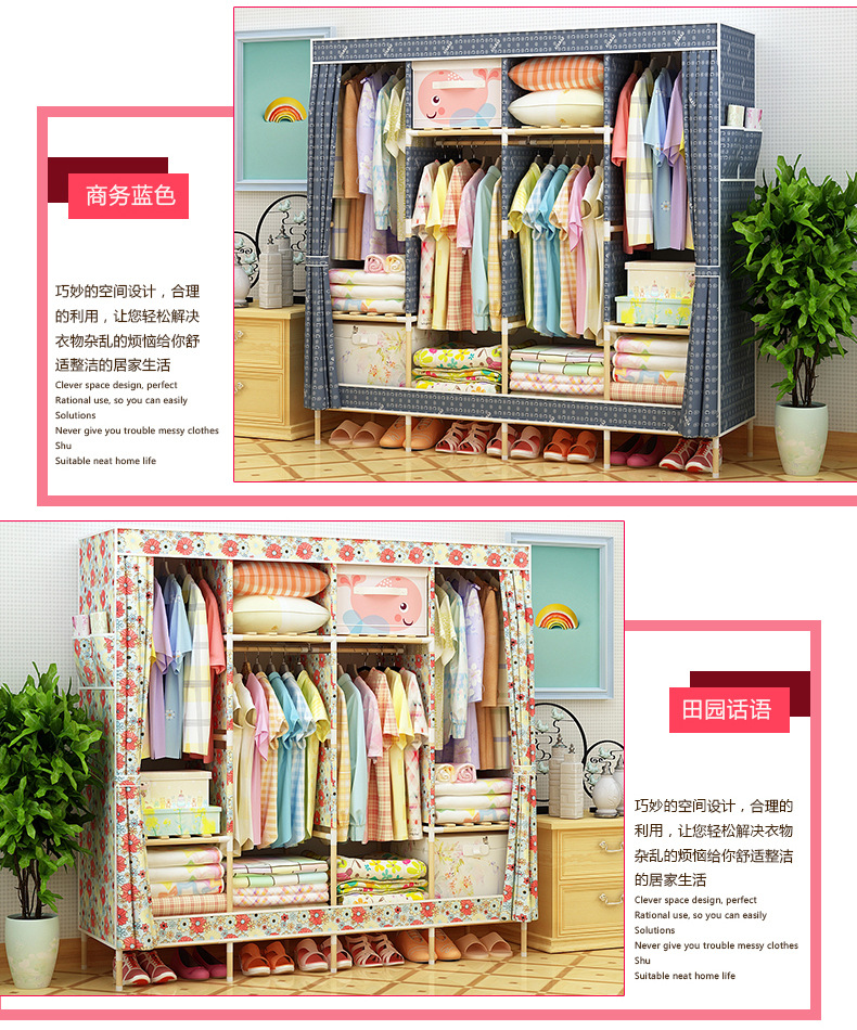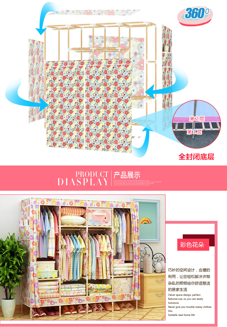 美汇特供:2017新款超大容量加粗实木简易衣柜牛津布衣橱防尘收纳布衣柜