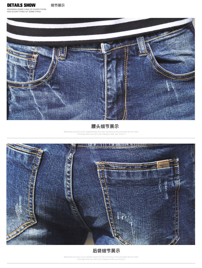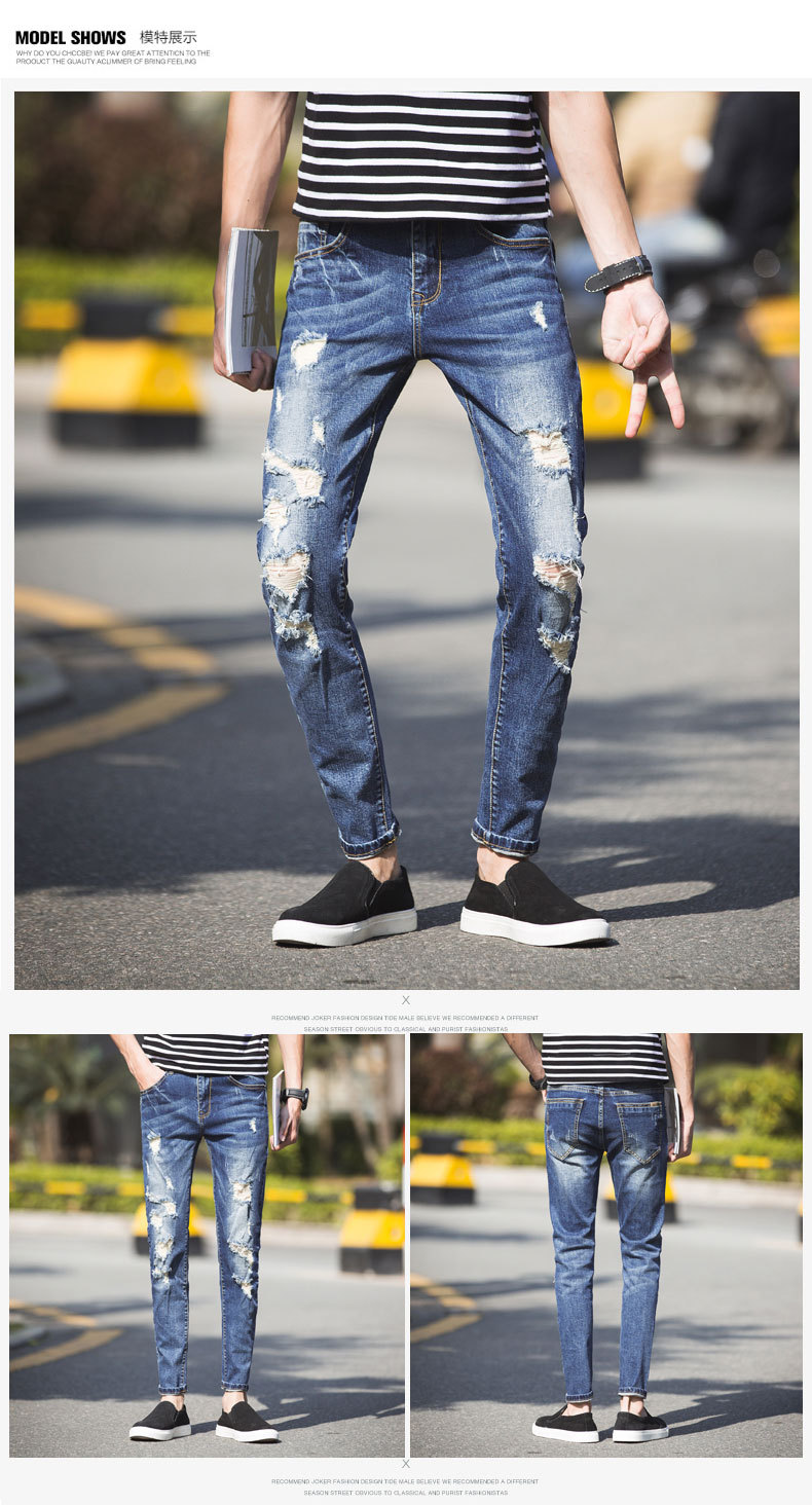 美汇特供:2017春夏牛仔裤男破洞男款九分韩版男装9分修身潮流小脚牛仔裤