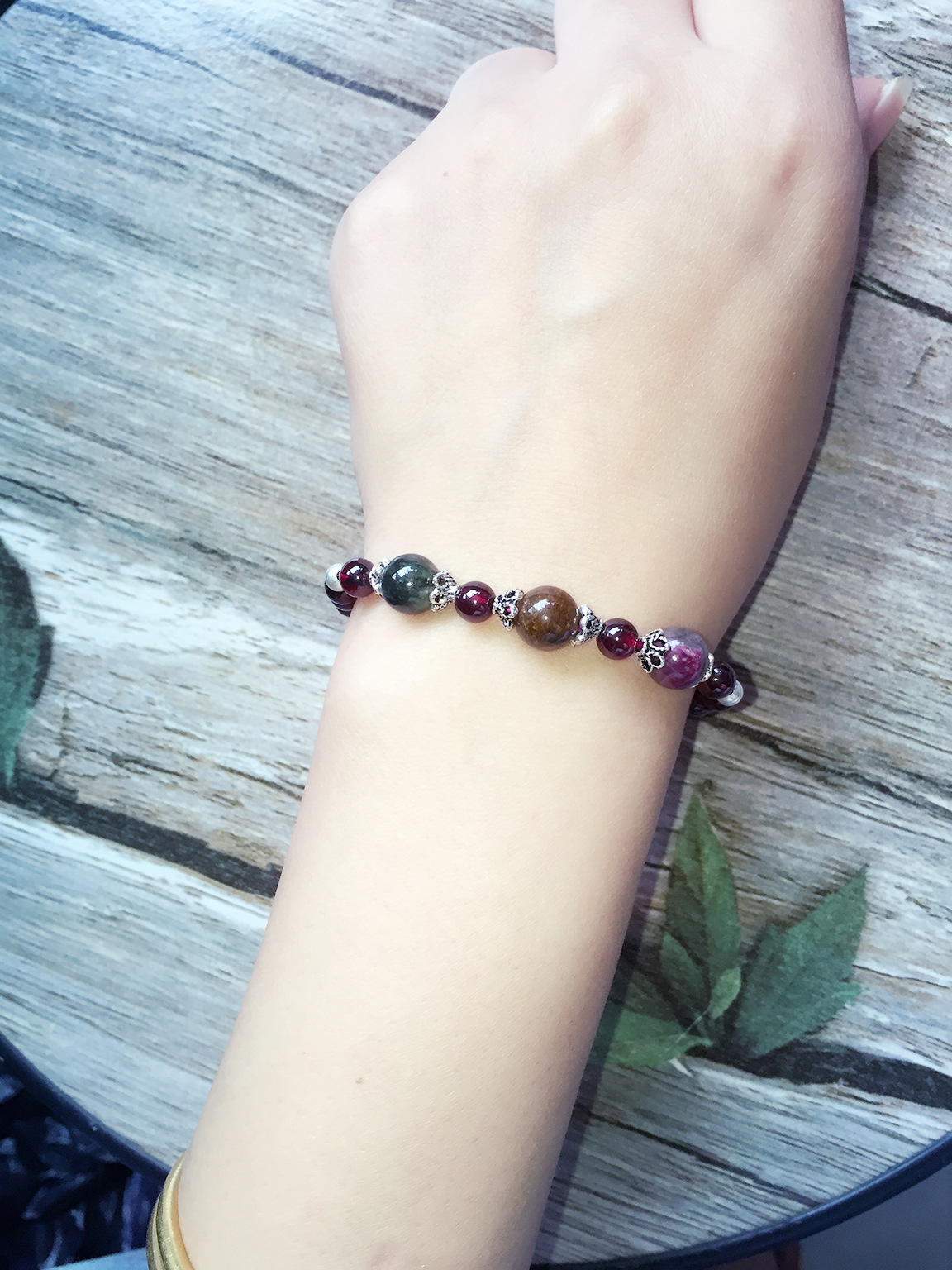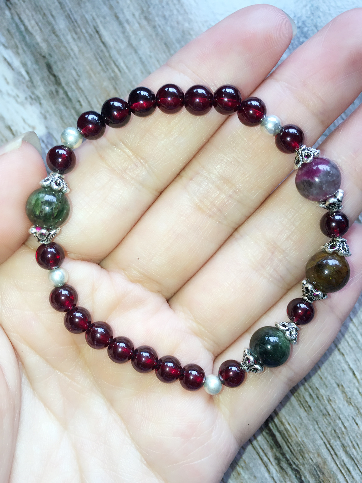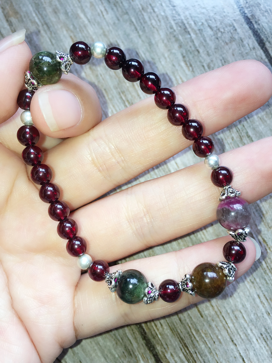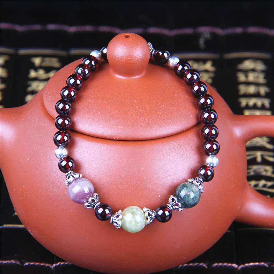 美汇特供:2017热款925银进口5A级石榴石女人石配碧玺单圈手链手串