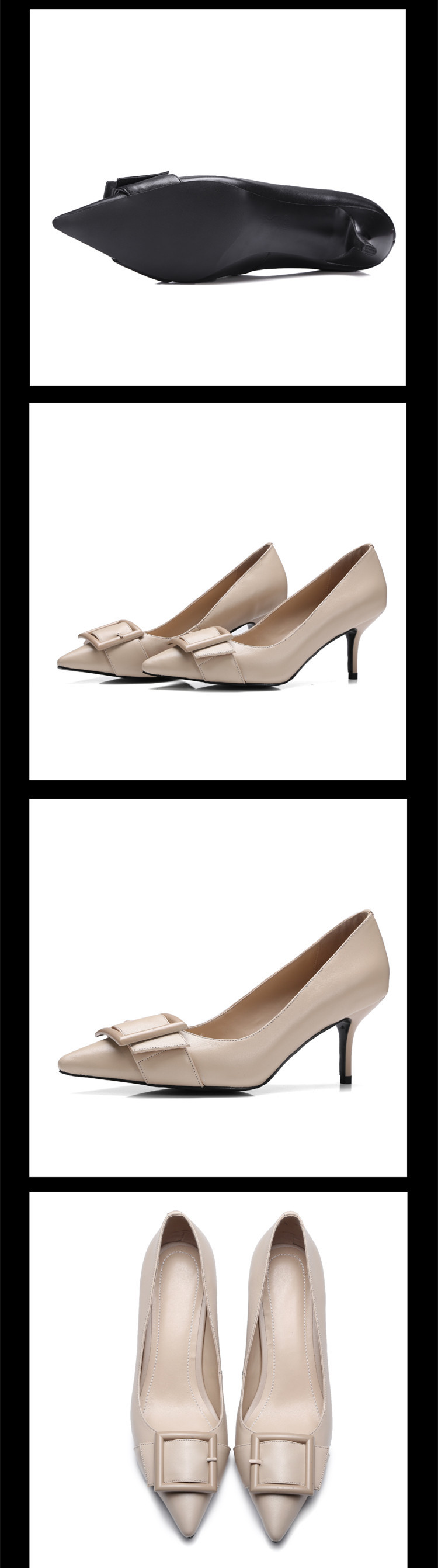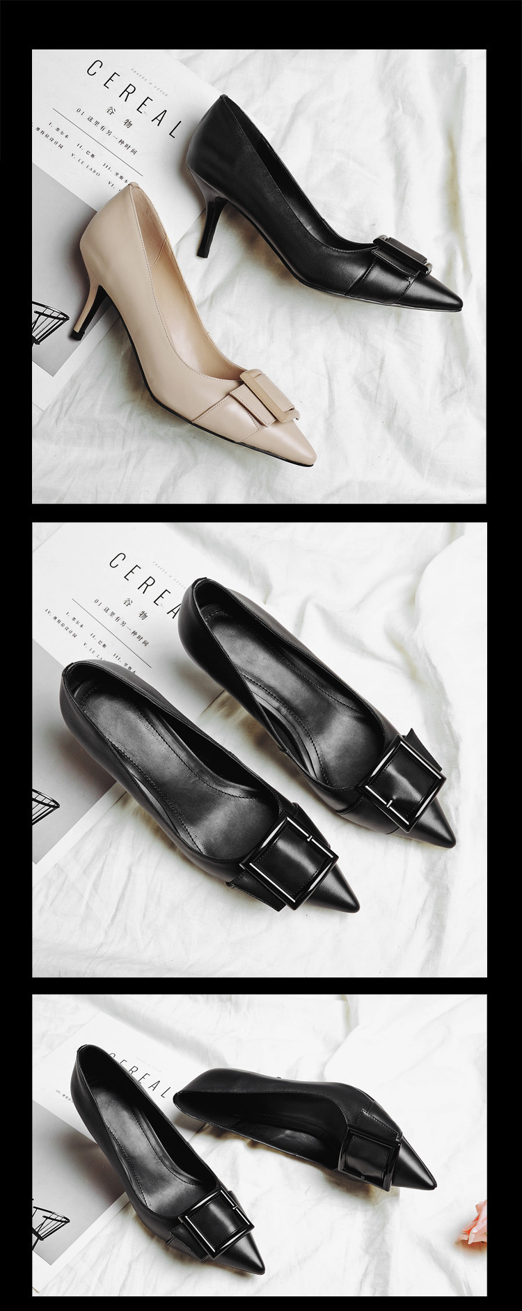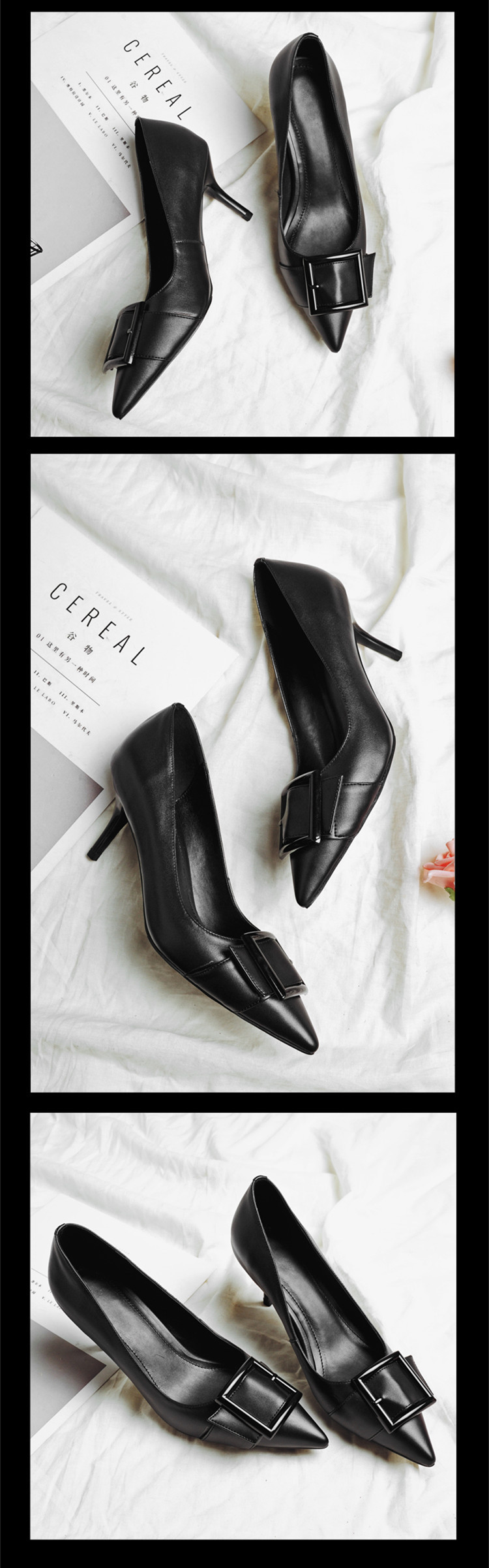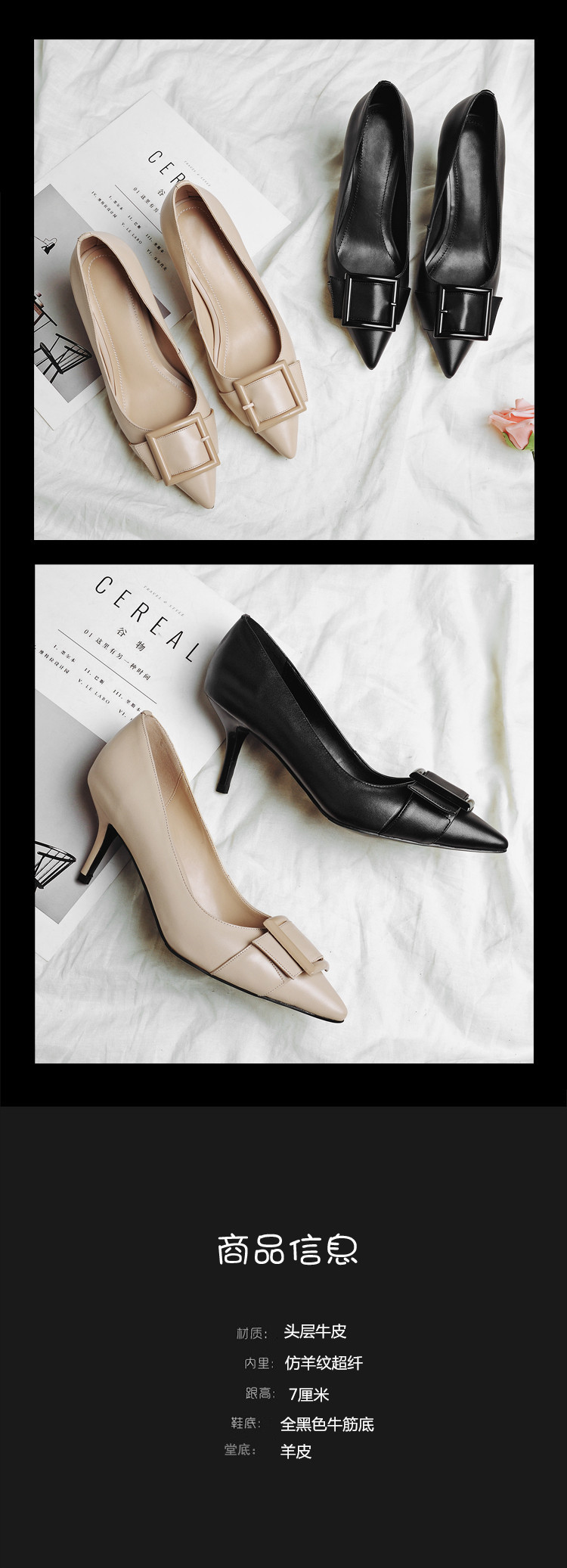 美汇特供:2017秋季新款全皮女鞋韩版头层皮尖头浅口方扣细跟真皮单鞋高跟鞋