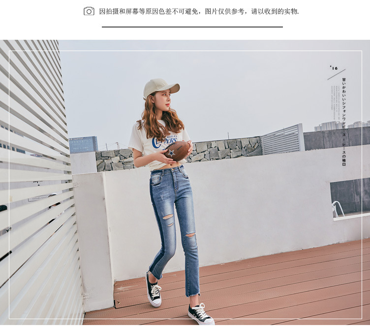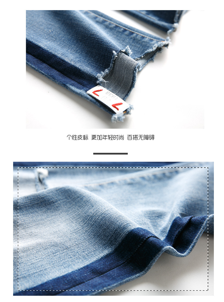 美汇特供:17秋冬女装新款侧边条九分裤时尚弹力破洞牛仔裤女高腰微喇牛仔裤