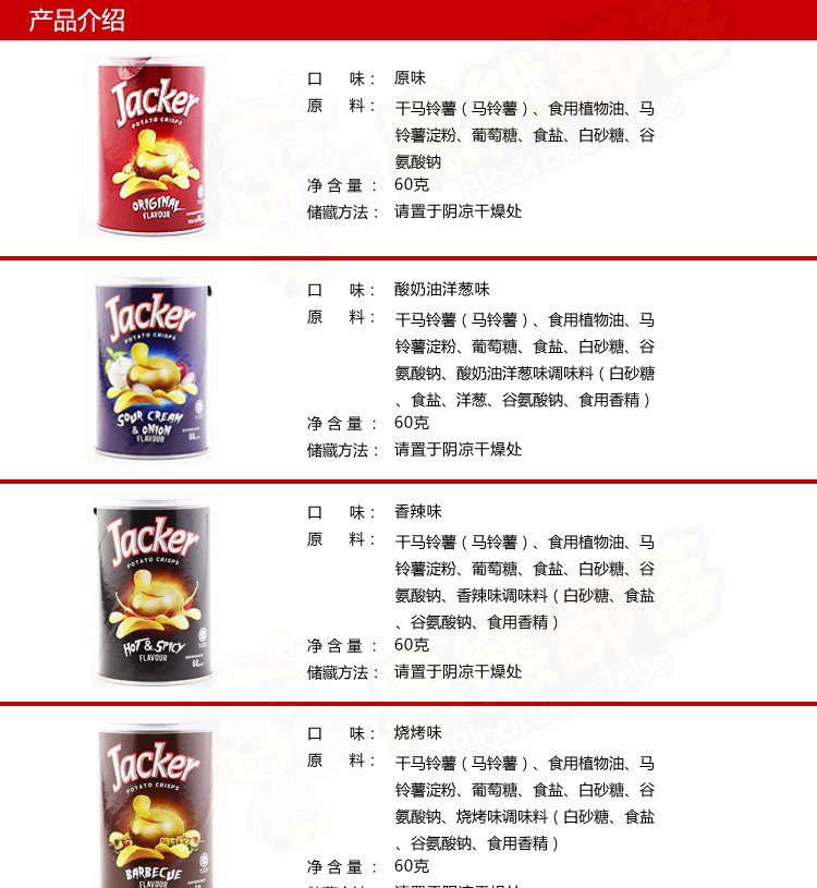 美汇特供:马来西亚进口食品 杰克Jacker薯片 休闲零食 罐装60g*2罐