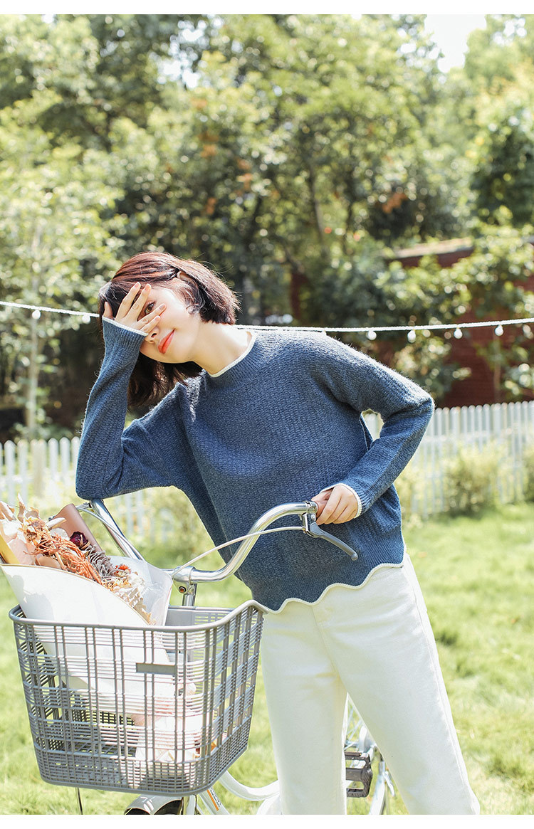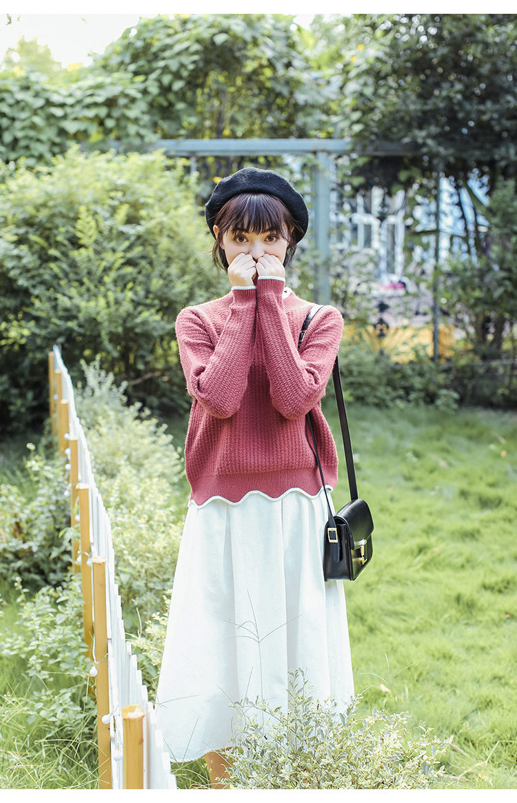 美汇特供:2017秋冬韩版甜美小清新撞色圆领超减龄波浪边短款套头毛衣打底衫
