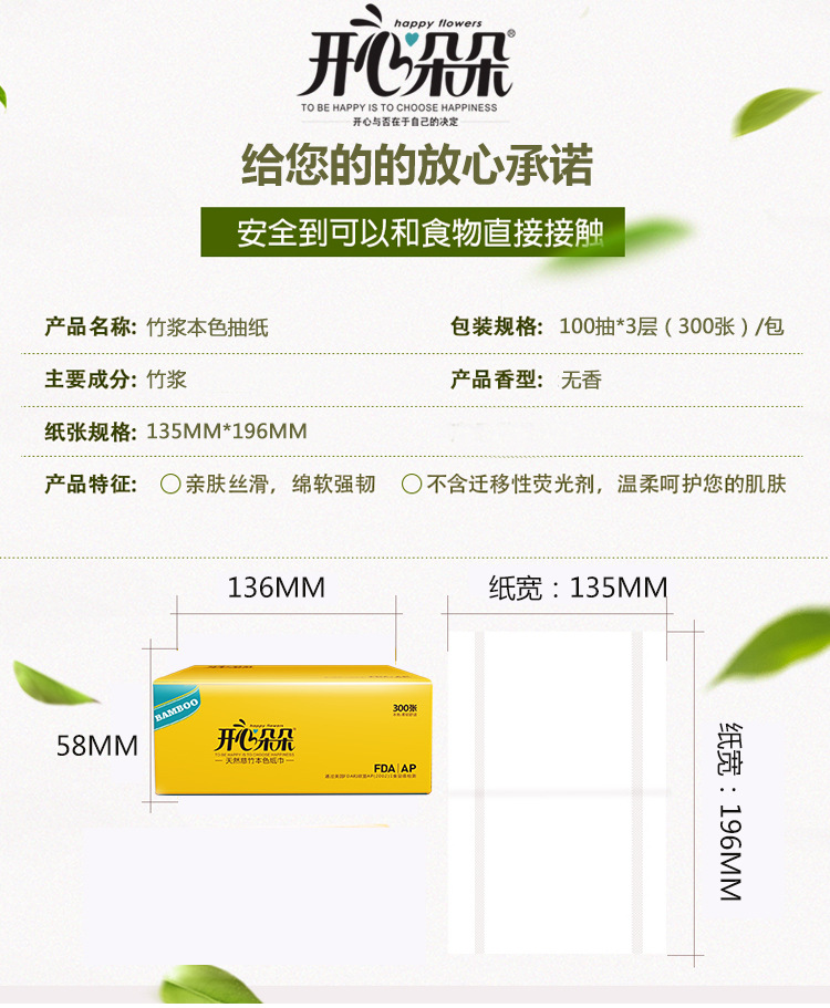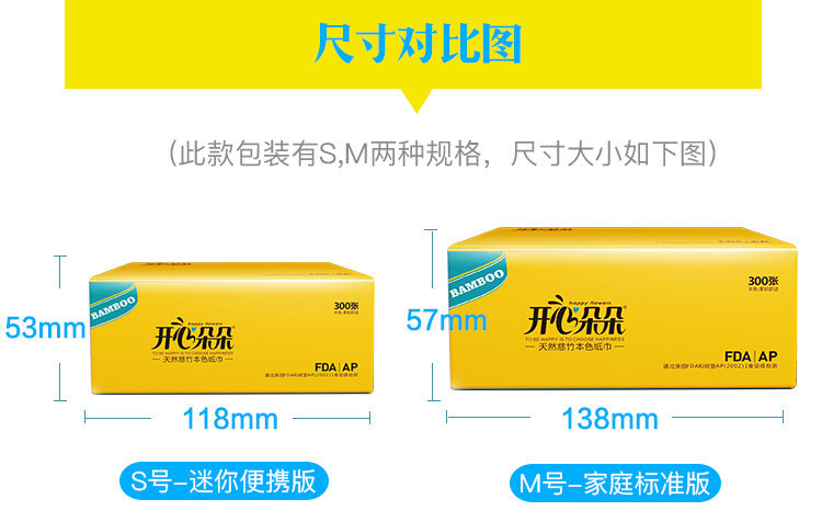 美汇特供:开心朵朵家用竹浆本色抽纸面巾纸6包装300张纸巾