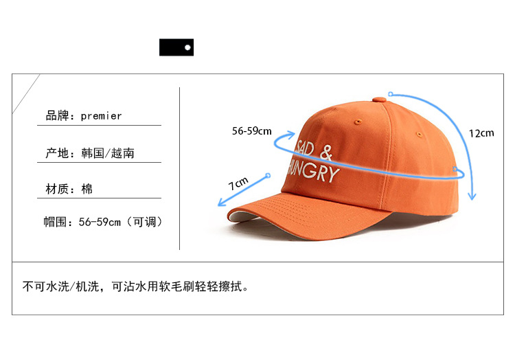 美汇特供:韩国进口premier潮牌时尚男女棒球帽桔色韩版鸭舌帽字母刺绣春夏弯檐帽
