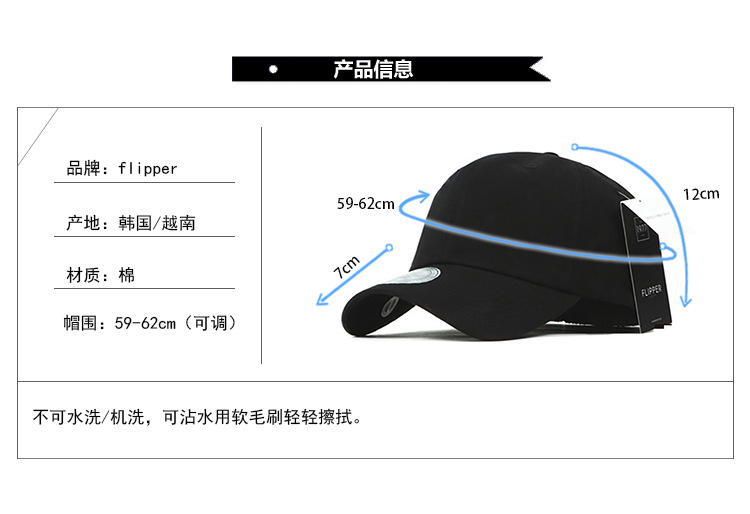 美汇特供:韩国进口flipper大号棒球帽纯黑色鸭舌帽光身大头围男弯沿帽