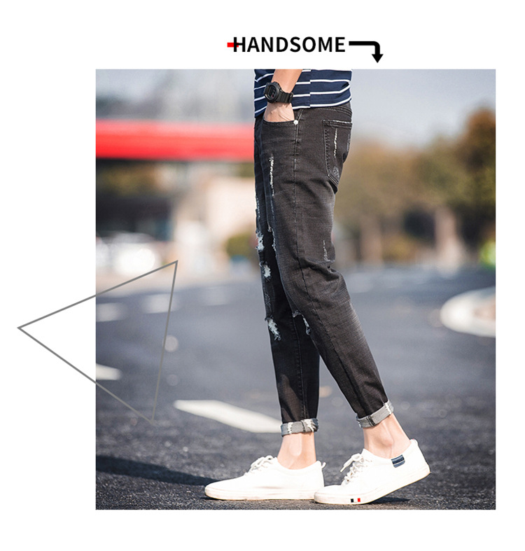 美汇特供:男士时尚破洞小哈伦小脚九分牛仔裤2018日系修身弹力休闲9分裤