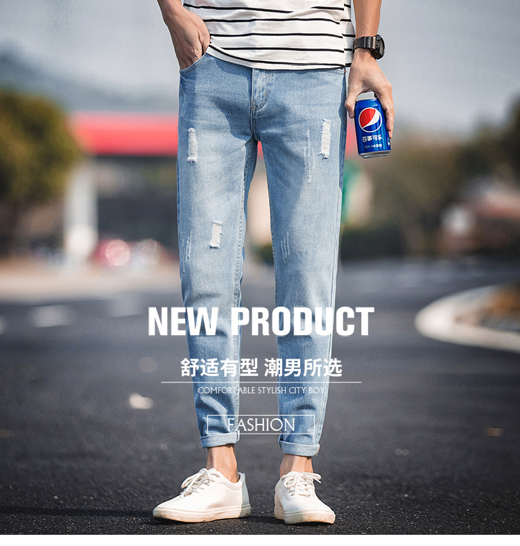 美汇特供:男士破洞小哈伦小脚九分牛仔裤2018日系修身弹力休闲9分裤