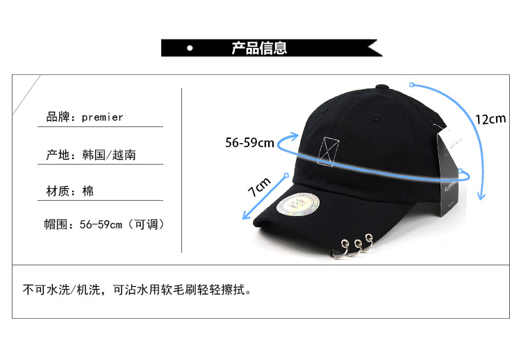 美汇特供:韩国进口premier男女棒球帽夏个性铁环鸭舌帽时尚潮牌遮阳弯檐帽