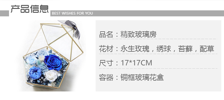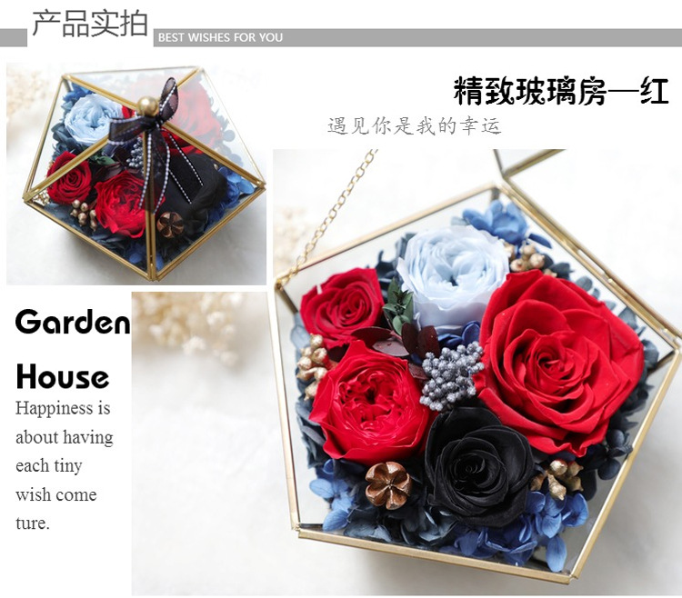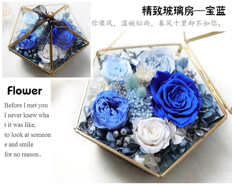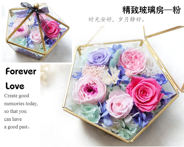 美汇特供:进口永生花玫瑰花房摆件玻璃罩礼盒七夕情人节生日礼物保鲜花干花
