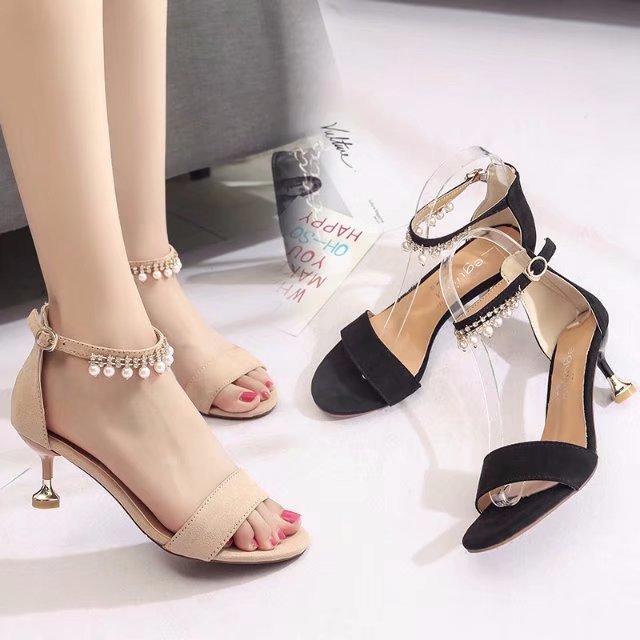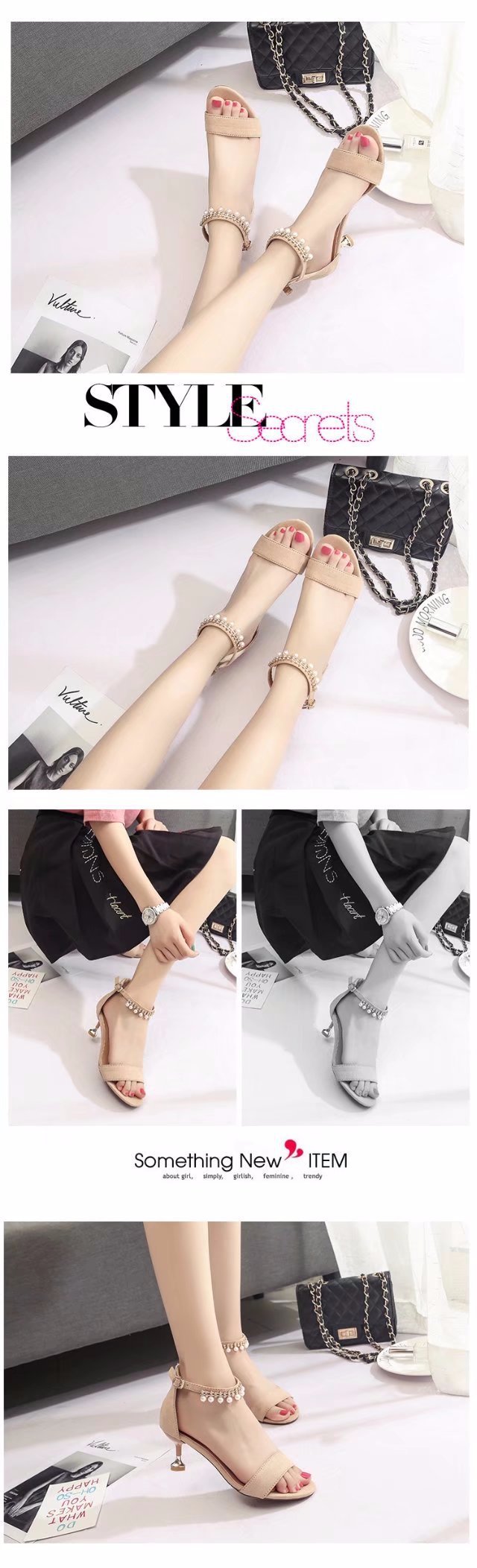 美汇特供:新款夏季流苏细跟高跟鞋一字带扣珠子凉鞋气质露趾时尚欧美女鞋潮
