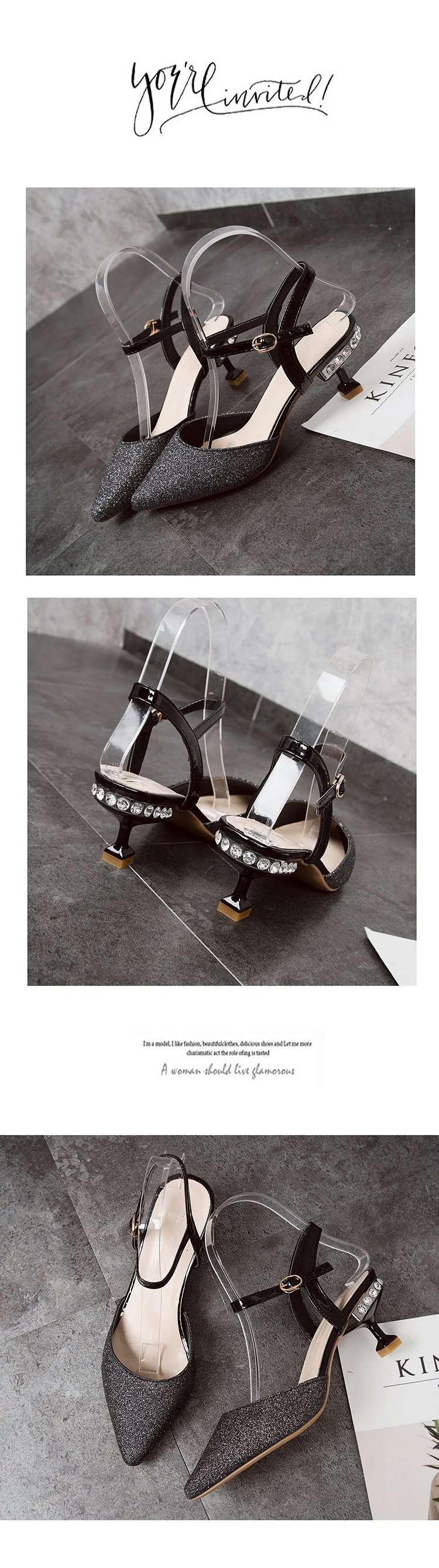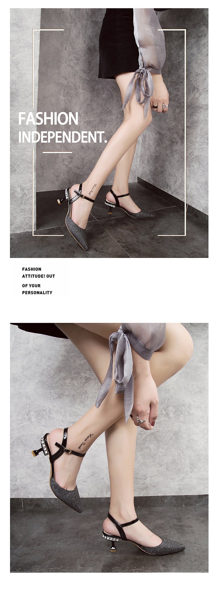 美汇特供:2018夏季新款包头凉鞋高跟鞋女尖头细跟水钻女鞋一字扣中空