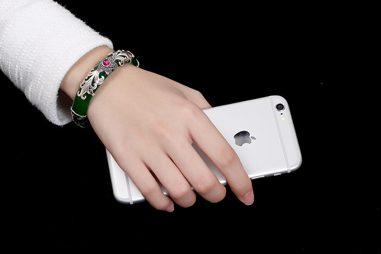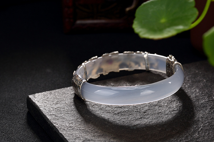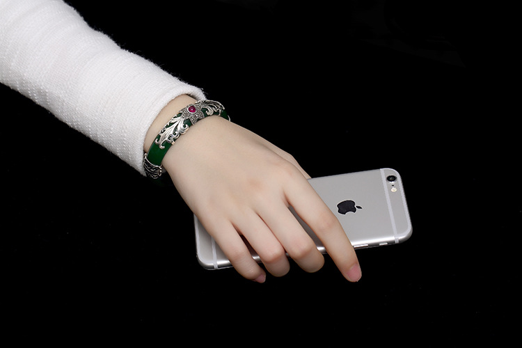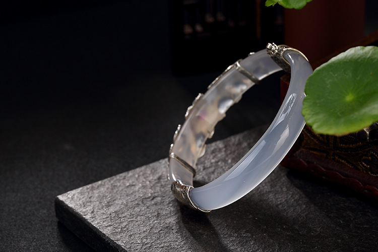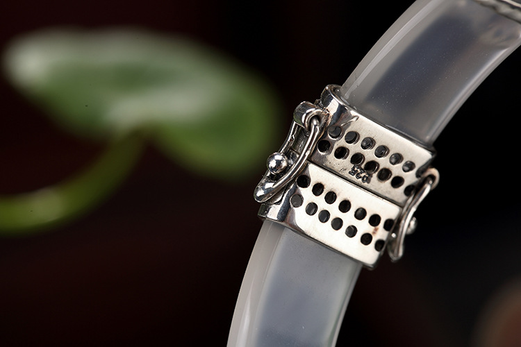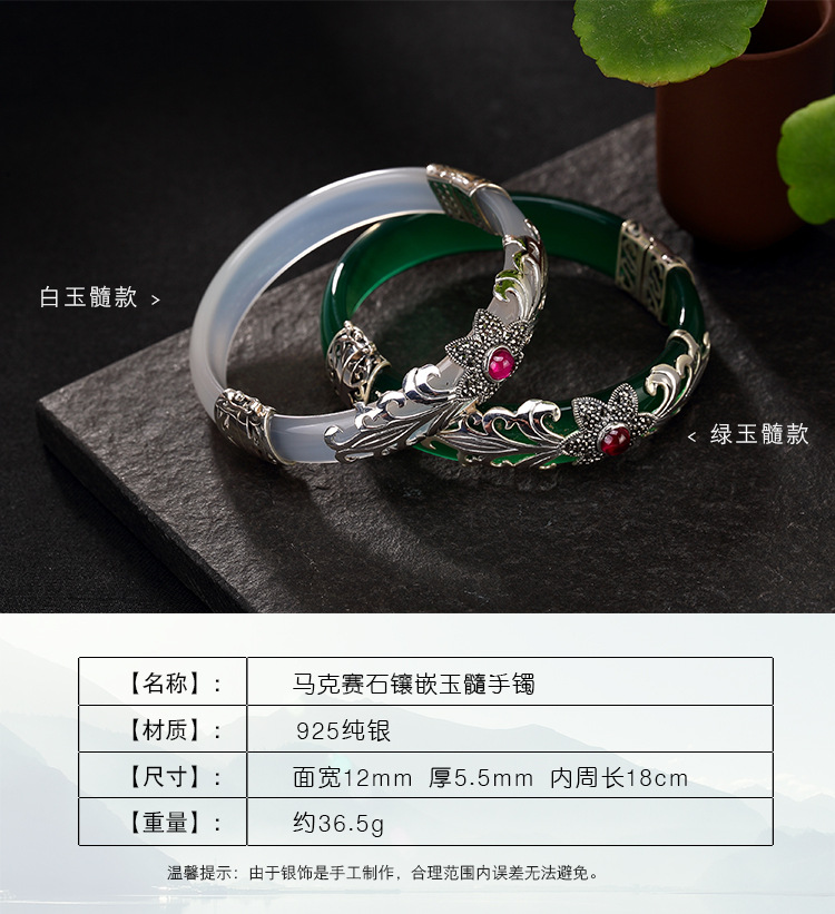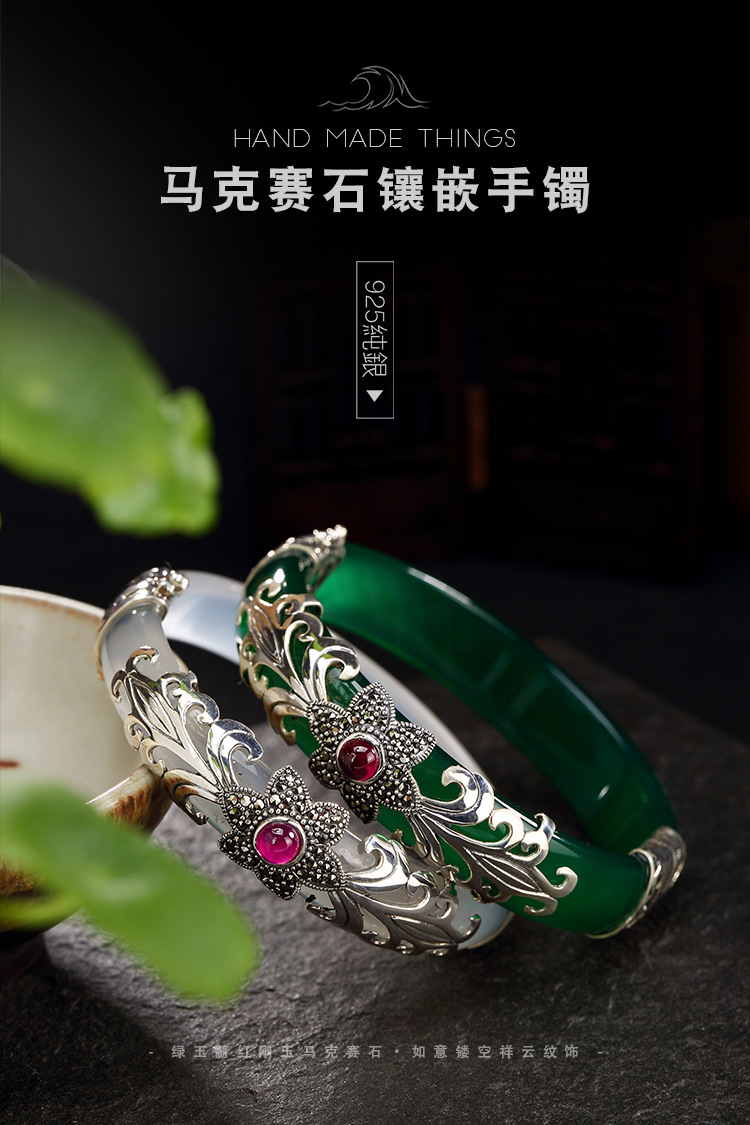 美汇特供:母亲节礼物 壹鹿银S925纯银马克赛石镶嵌白绿玉髓开口手镯高档百搭女手环
