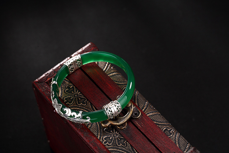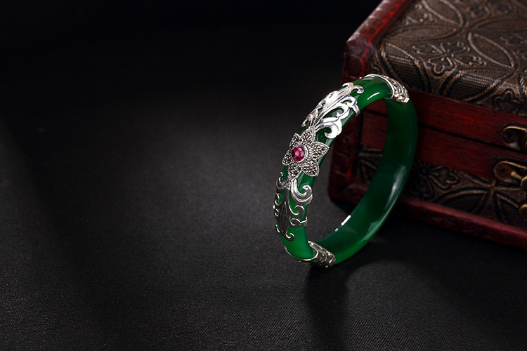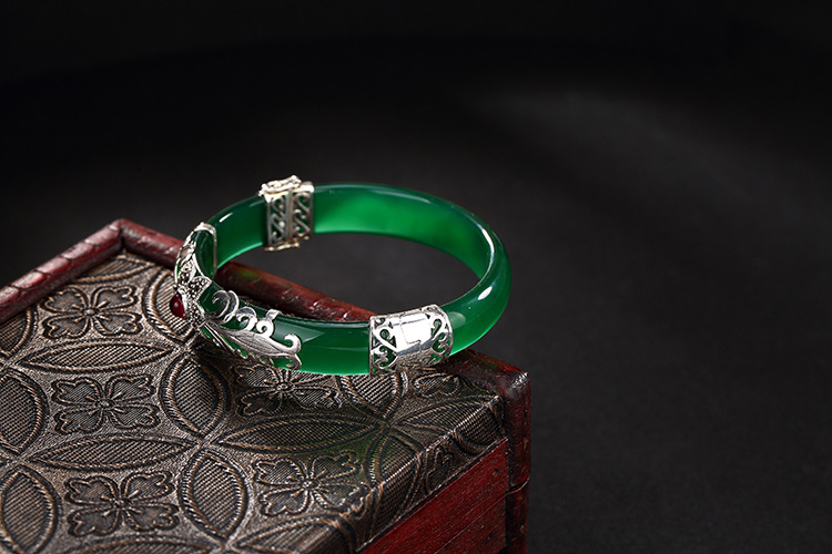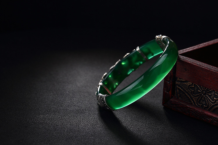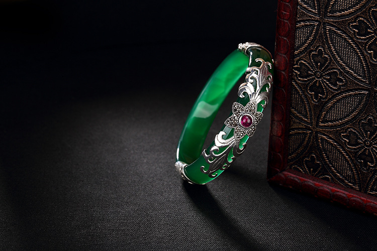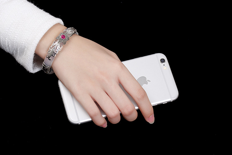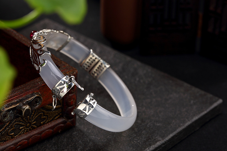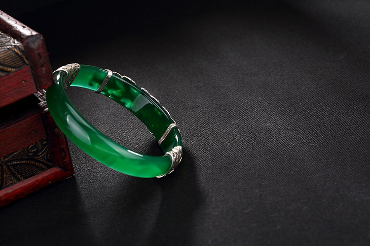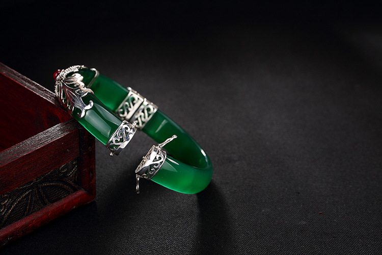 美汇特供:母亲节礼物 壹鹿银S925纯银马克赛石镶嵌白绿玉髓开口手镯高档百搭女手环