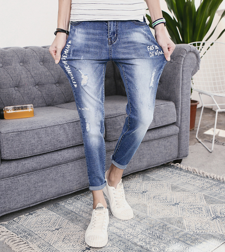美汇特供:夏季新款破洞牛仔裤男夏季潮流修身小脚裤韩版弹力男式个性九分裤