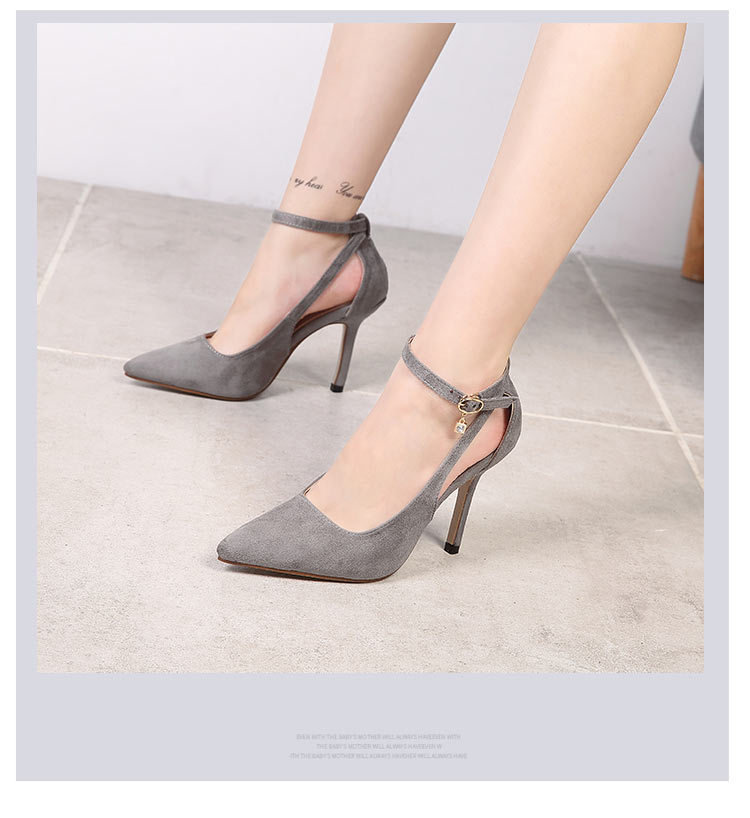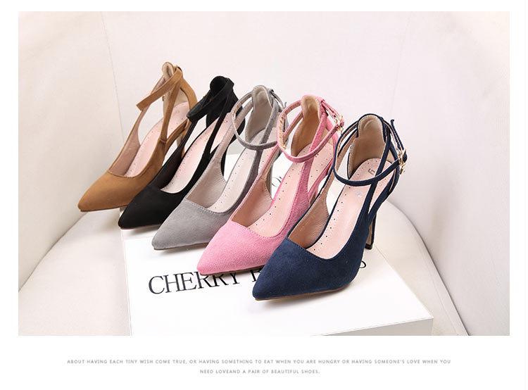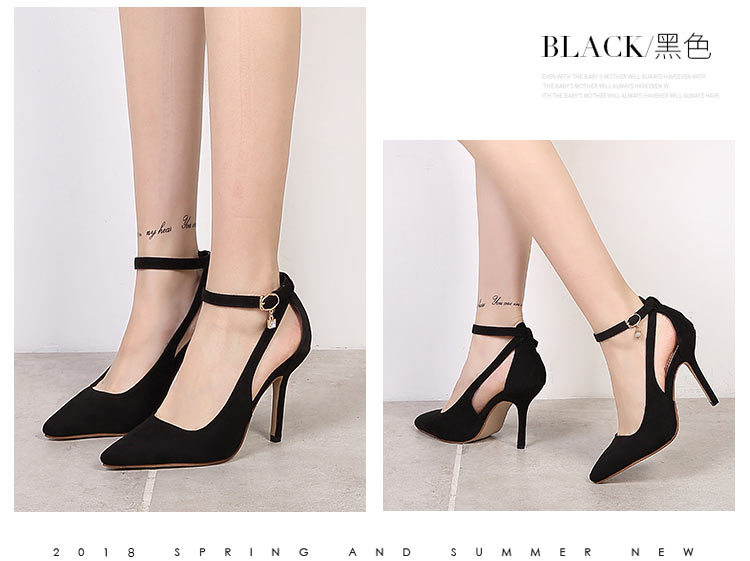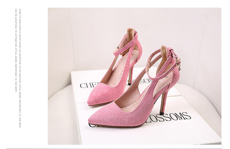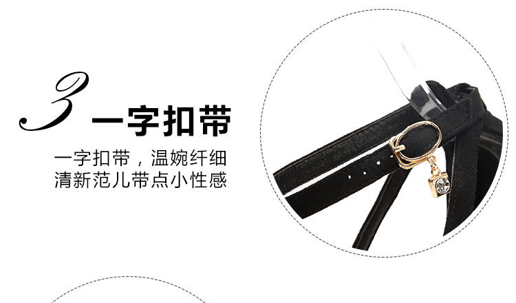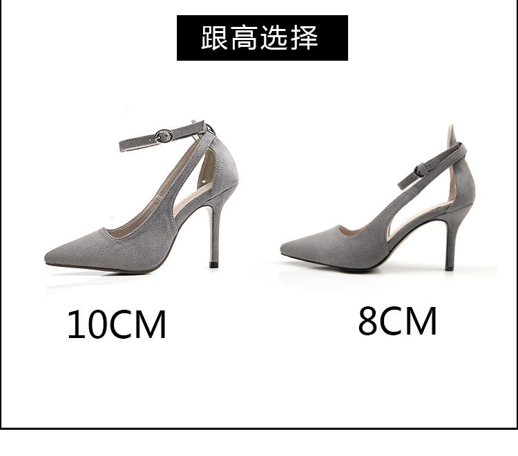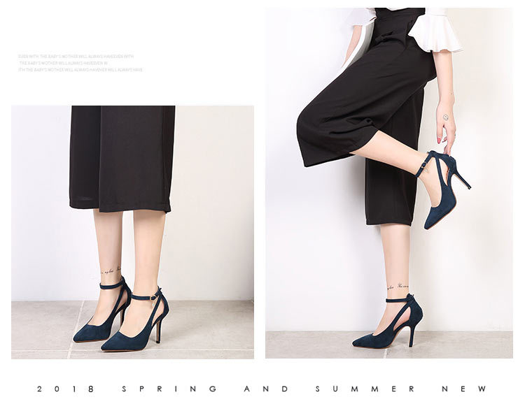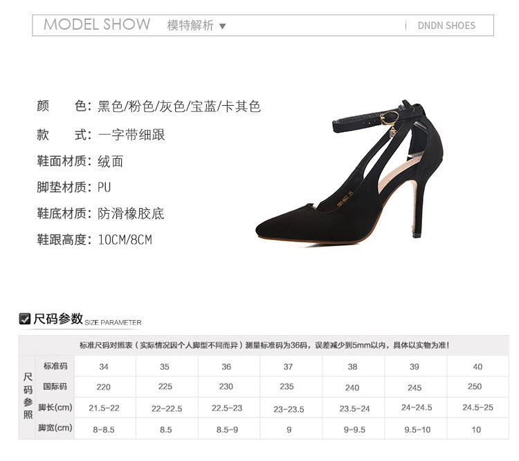 美汇特供:2018新款女鞋夏尖头一字扣高跟鞋细跟水钻女士绒面浅口单鞋女