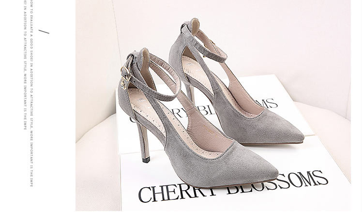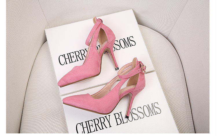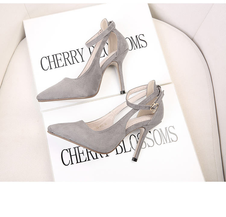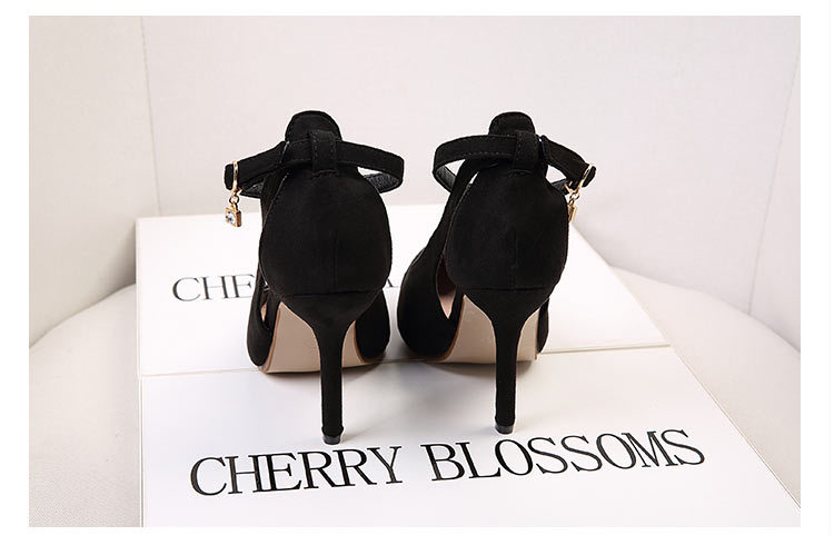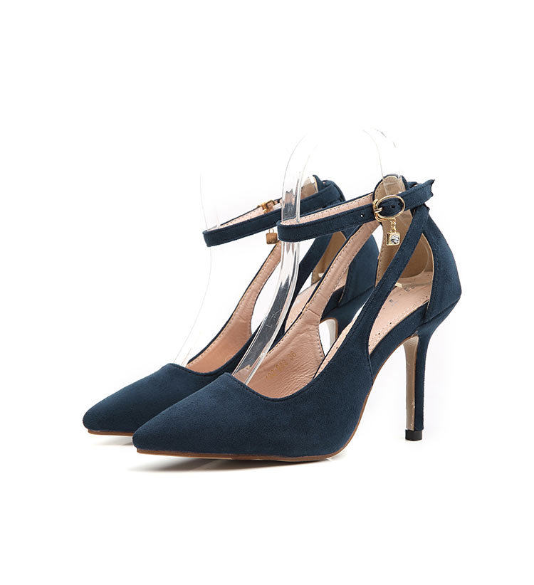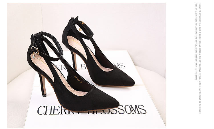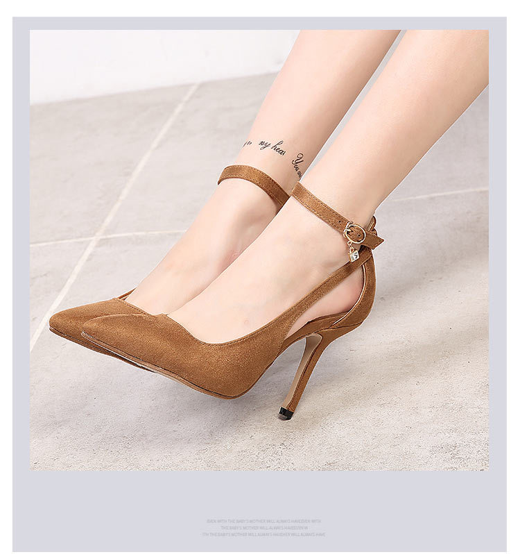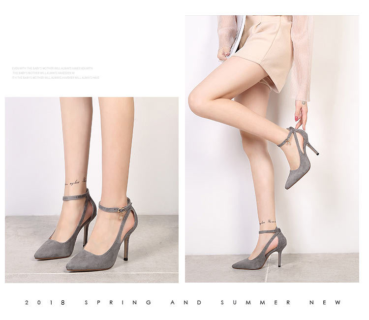 美汇特供:2018新款女鞋夏尖头一字扣高跟鞋细跟水钻女士绒面浅口单鞋女