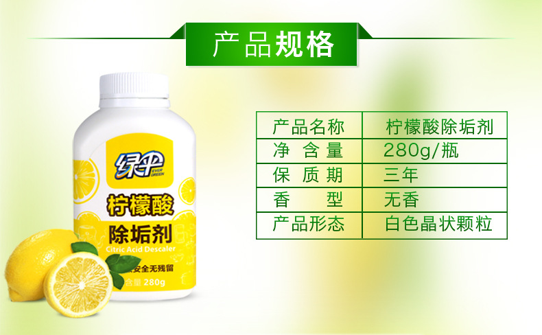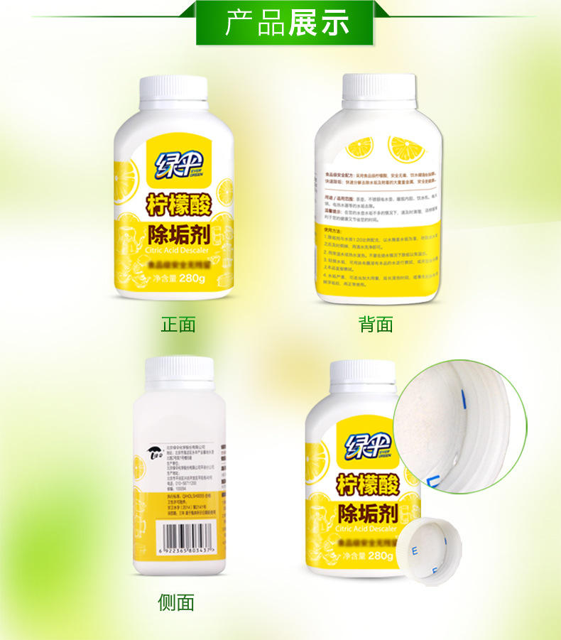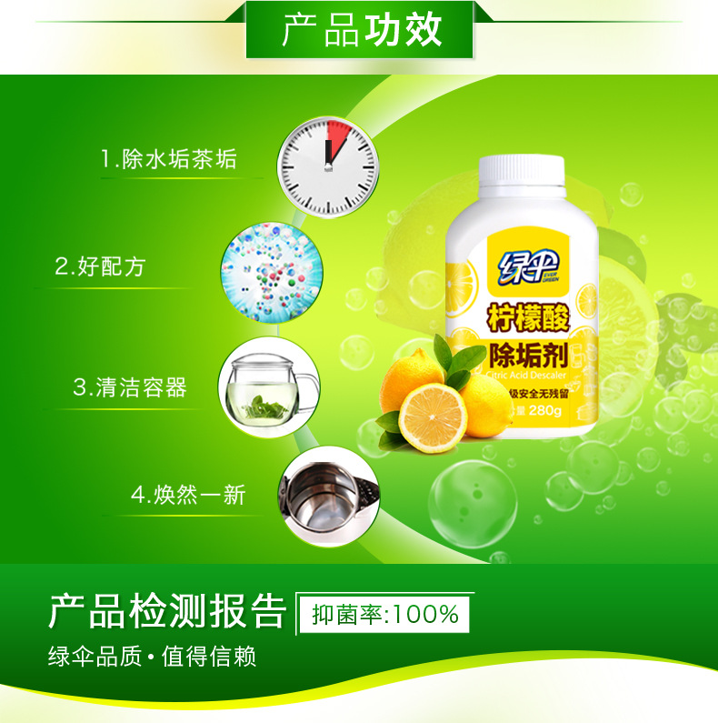 美汇特供:绿伞柠檬酸除垢剂280g*2瓶食品级去除水垢清洁剂饮水机清洗剂
