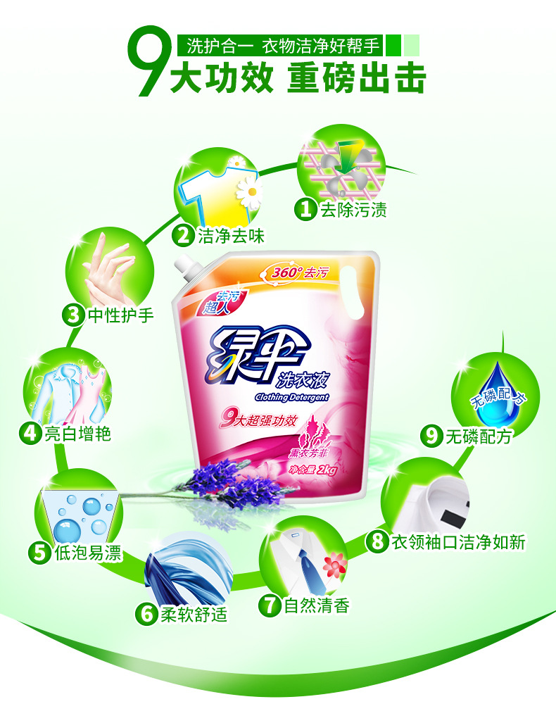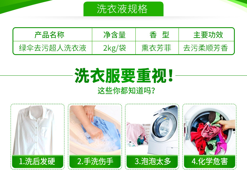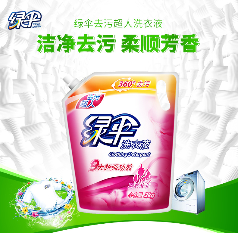 美汇特供:绿伞洗衣液2kg袋装 深层洁净护色薰衣草香洗衣液