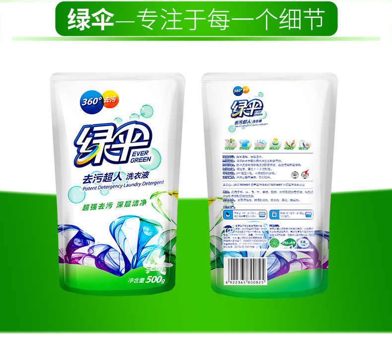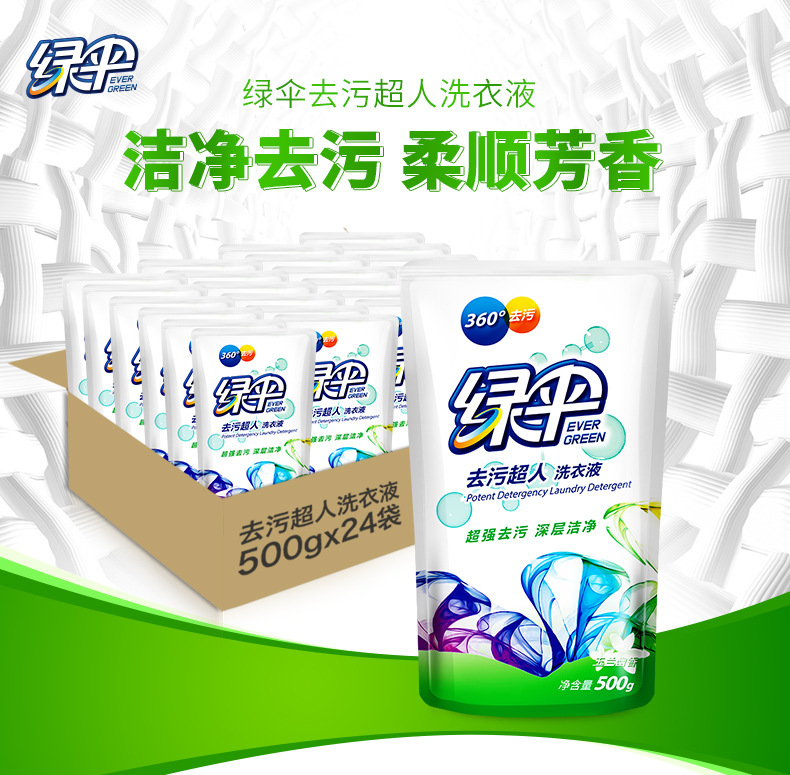 美汇特供:绿伞去污超人洗衣液500g*24袋装家庭装袋玉兰幽香衣物护理