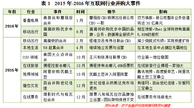 2015年,滴滴快的、58赶集、美团大众点评、携程去哪儿、优酷土豆、百合世纪佳缘相互牵手,从此“天下归于一家”。似乎一瞬间,合作成为行业主题,风险资本大力投入后,纷纷准备“收割”了。延续到2016年,行业小并购不断,大并购事件相对缺乏,不过,美丽说蘑菇街合并、滴滴收购优步中国,依然引起了市场不小的轰动。